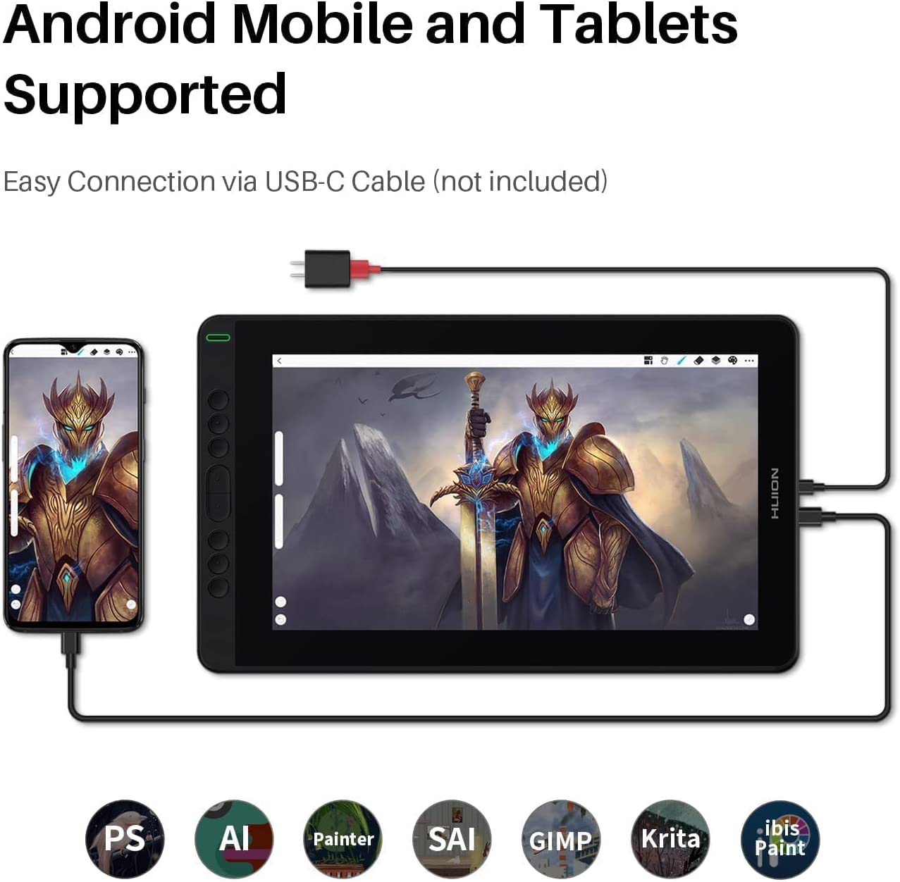 Bảng vẽ LCD Huion Kamvas 13 (Android), màn hình IPS 13.3in, full HD 1920×1080, tỷ lệ 16:9, độ phân giải bảng vẽ 5080lpi, bút vẽ PW517 không pin 8192 mức lực nhấn, cảm ứng ±60° nghiêng, kết nối USB-C. Hai chế độ sử dụng, bảng vẽ/bảng vẽ LCD.