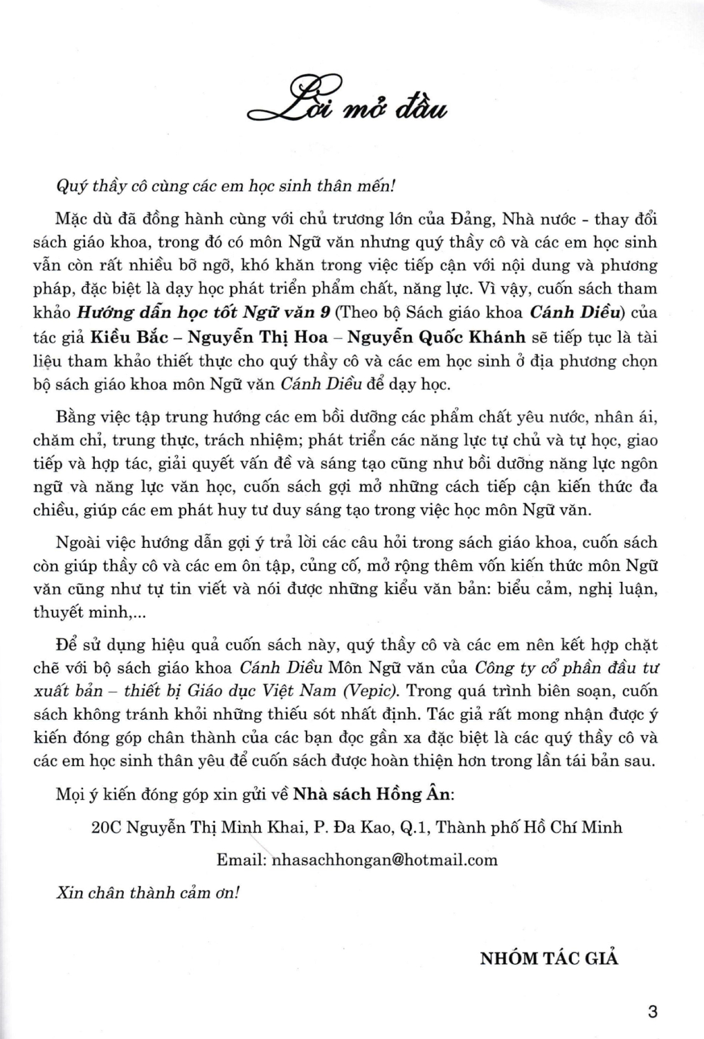 Mặc dù đã đồng hành cùng với chủ trương lớn của Đảng, Nhà nước - thay đổi sách giáo khoa, trong đó có môn Ngữ văn nhưng quý thầy cô và các em học sinh vẫn còn rất nhiều bỡ ngỡ, khó khăn trong việc tiếp cận với nội dung và phương pháp, đặc biệt là dạy học phát triển phẩm chất, năng lực. Vì vậy, cuốn sách tham khảo Hướng dẫn học tốt Ngữ văn 9 (Theo bộ Sách giáo khoa Cánh Diều) của tác giả Kiểu Bắc – Nguyễn Thị Hoa - Nguyễn Quốc Khánh sẽ tiếp tục là tài liệu tham khảo thiết thực cho quý thầy cô và các em học sinh ở địa phương chọn bộ sách giáo khoa môn Ngữ văn Cánh Diều để dạy học.