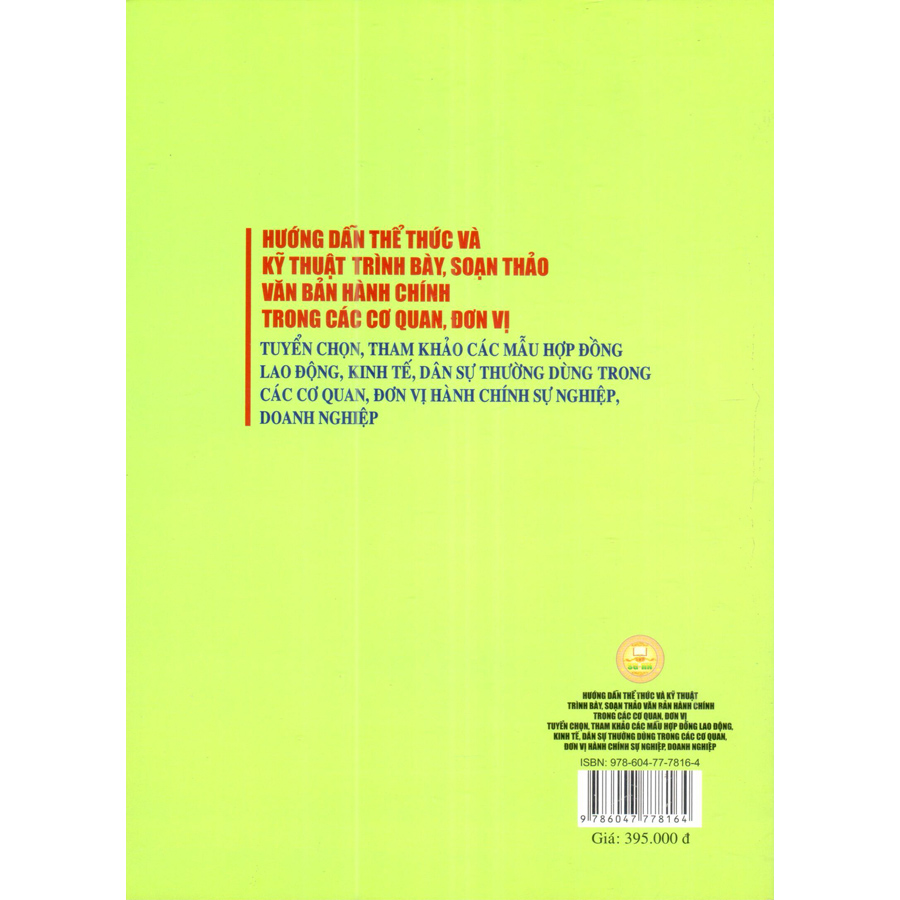 Ngày 05/03/2020, Chính phủ đã ban hành Nghị định số 30/2020/NĐ-CP về công tác văn thư, thay thế Nghị định 110/2004/NĐ-CP và Nghị định 09/2010/NĐ-CP. Nghị định này cũng chính thức có hiệu lực từ ngày ban hành và có nhiều điểm mới như: Bắt buộc dùng phông chữ Times New Roman trong văn bản; Chỉ sử dụng khổ giấy A4 cho tất cả các loại văn bản; Thay đổi cách đánh số trang văn bản; Phải ghi cả tên cơ quan chủ quản; Quy định các trường hợp bắt buộc viết hoa trong văn bản hành chính, trong đó có quy định văn bản điện tử có giá trị pháp lý như bản gốc văn bản giấy… Hiện nay việc soạn thảo một bản hợp đồng đáp ứng được các yêu cầu của công việc cũng như đảm bảo tính pháp lý là công việc không đơn giản và rất quan trọng đối với mỗi cá nhân, mỗi doanh nghiệp, đối với người làm công việc kinh Nhằm giúp những người soạn thảo văn bản, hợp đồng trong kinh doanh, thuận tiện trong việc đối chiếu và tham khảo để có thể chuẩn bị tốt việc ban hành văn bản, ký kết hợp đồng phù hợp với hoàn cảnh thực tiễn của doanh nghiệp, của cá nhân theo quy định pháp luật, Nhà xuất bản Thế Giới tổ chức biên soạn cuốn sách: Hướng Dẫn Thể Thức Và Kỹ Thuật Trình Bày, Soạn Thảo Văn Bản Hành Chính Trong Các Cơ Quan, Đơn Vị Hướng Dẫn Thể Thức Và Kỹ Thuật Trình Bày, Soạn Thảo Văn Bản Hành Chính Trong Các Cơ Quan, Đơn Vị Cuốn sách đã hệ thống tương đối đầy đủ các mẫu hợp đồng, văn bản trong giao dịch dân sự, thương mại, dịch vụ, xây dựng đã được sử dụng trong thực tế sinh hoạt, trong giao dịch của các công ty, doanh nghiệp, cá nhân và bao gồm các nội dung chính sau: