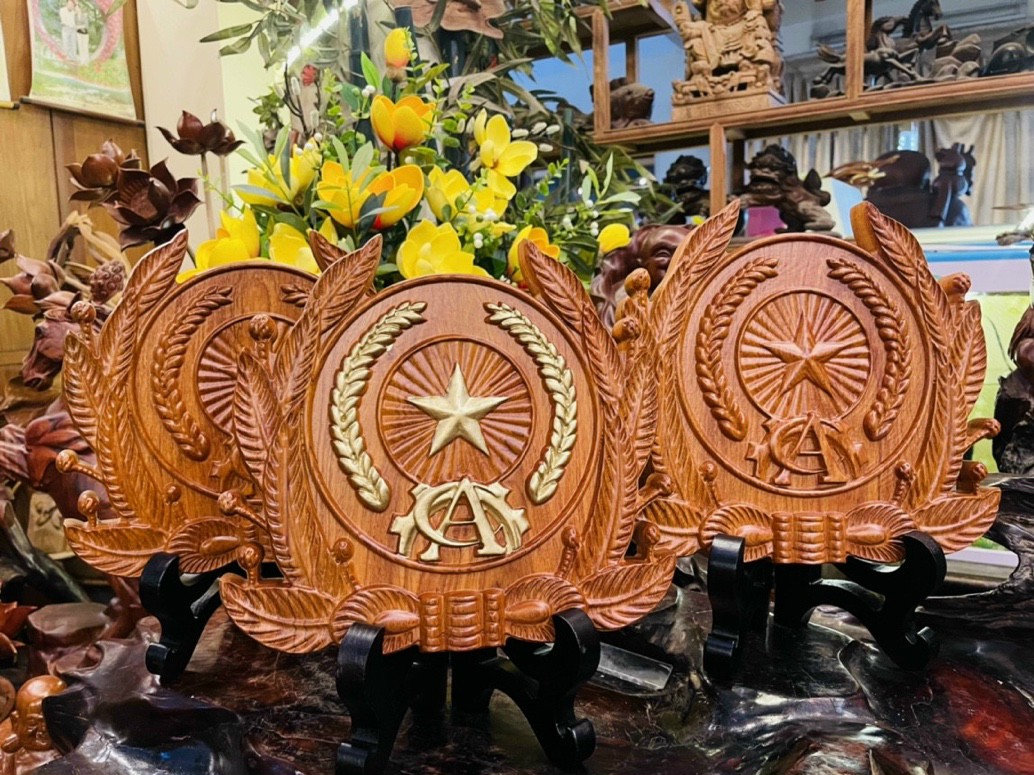 ✨Huy hiệu công an nhân dân trạm khắc bằng gỗ hương đá