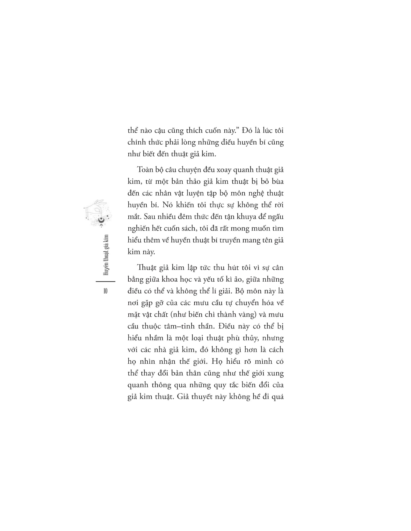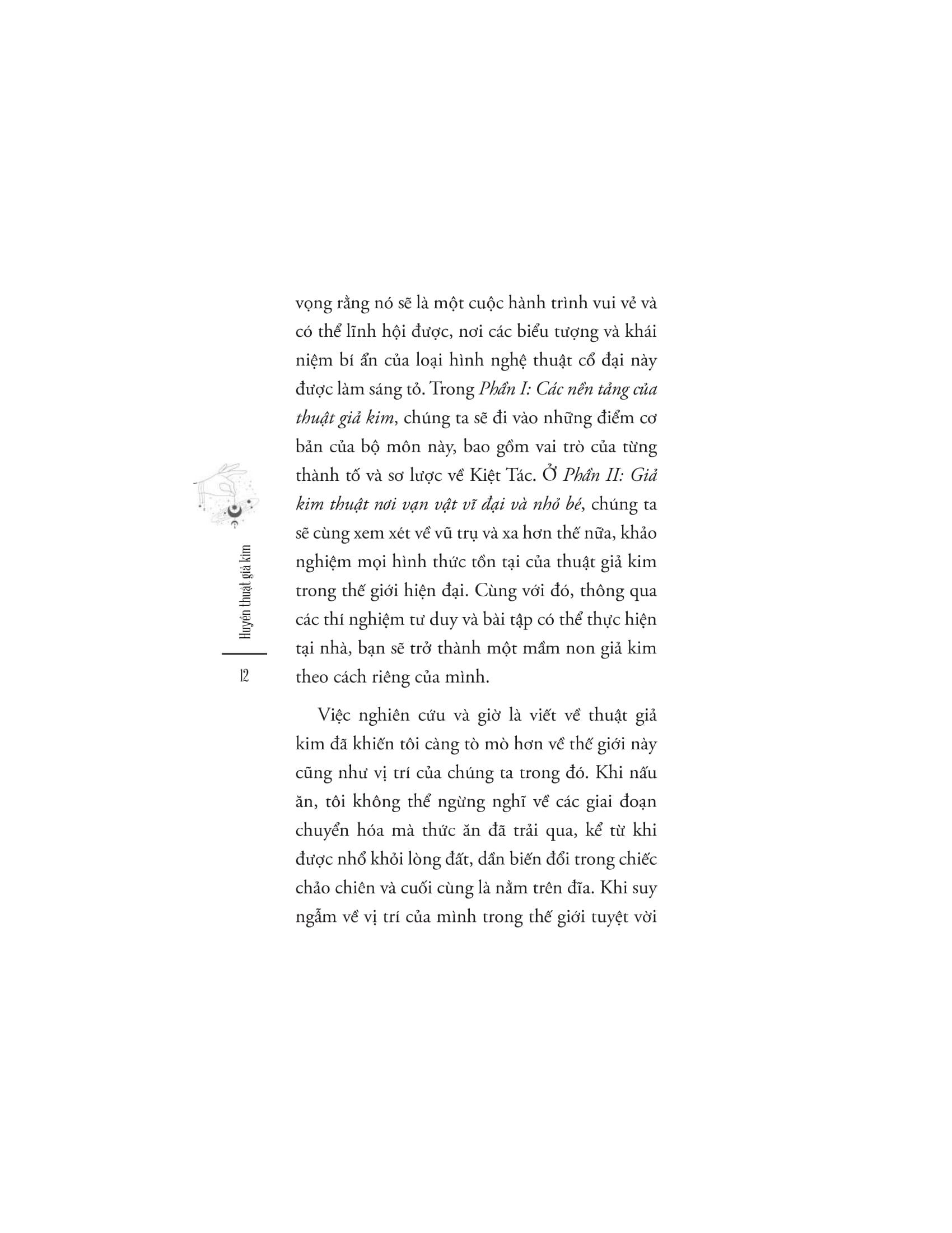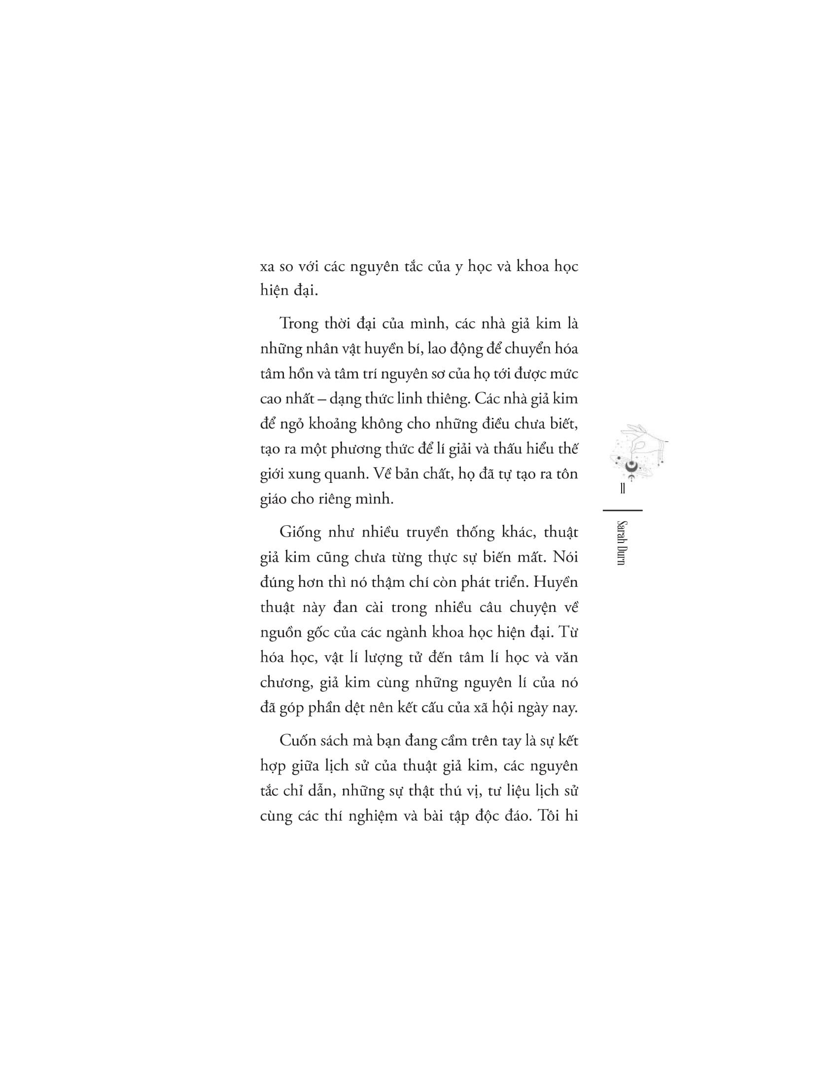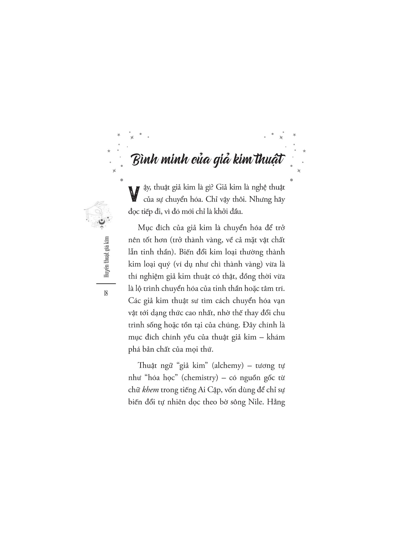 Nhắc tới giả kim, bạn hẳn sẽ tưởng tượng ra hình ảnh một cụ già với chòm râu lớn, ngồi nơi tầng hầm lâu đài, giữa những loại bột bí ẩn và chai lọ sủi bọt suốt ngày đêm để biến chì thành vàng. Nhưng giả kim ẩn chứa nhiều hơn thế. Nó là nghệ thuật của sự chuyển hóa, là chìa khóa để khai mở tiềm thức con người và là công cụ để giúp chúng ta đạt tới được dạng thức cao nhất của bản thể. Giống như nhiều truyền thống khác, thuật giả kim cũng chưa từng thực sự biến mất, thậm chí nó còn phát triển và đan cài trong nguồn gốc của các ngành khoa học hiện đại, từ vật lí lượng tử đến phân tâm học.