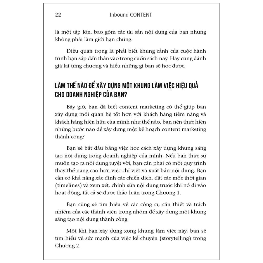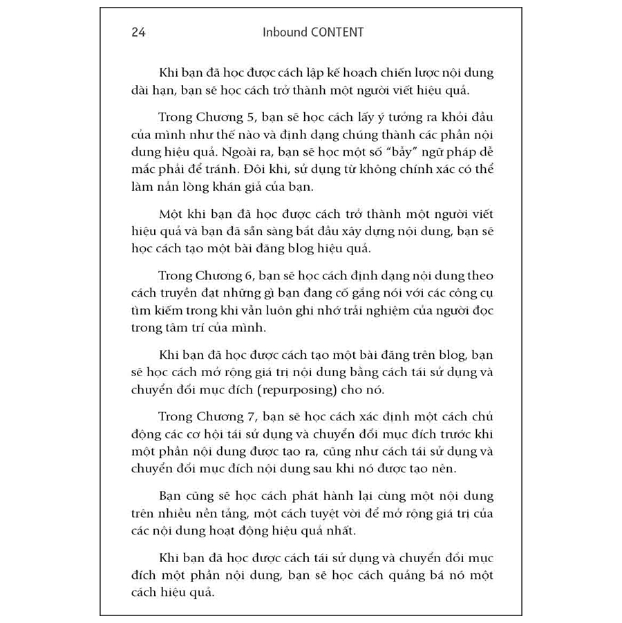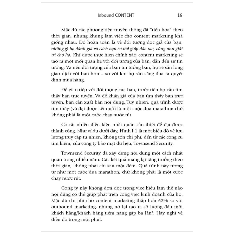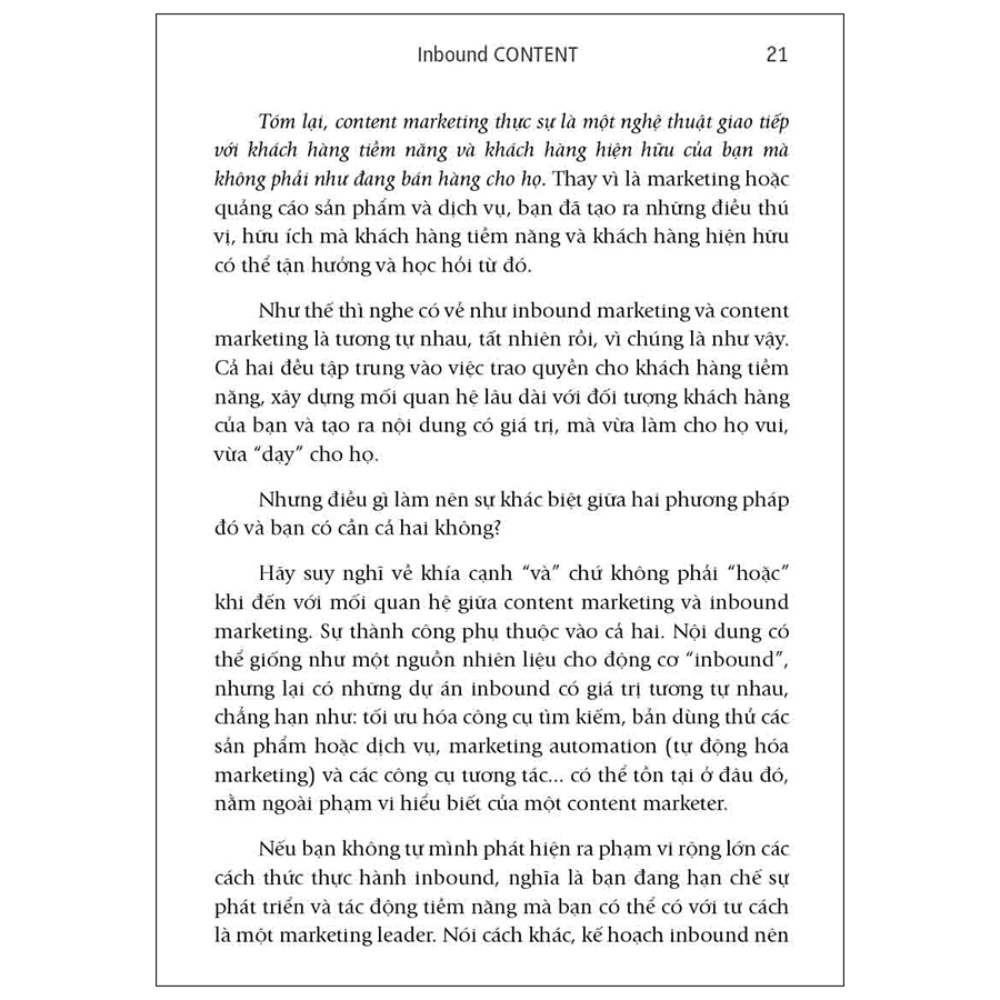 Nói như Bill Gates: “Content is King” (Nội dung là vua), ngày nay nội dung đang dần thống trị tất cả các chiến lược Digital Marketing, trở thành một yếu tố quan trọng giúp thương hiệu đạt được hiệu quả kinh doanh. Có một trang web và phương tiện truyền thông xã hội là không đủ. Nếu bạn thực sự muốn tận dụng mức độ kết nối chưa từng có, bạn phải tạo ra nội dung thu hút khách hàng. Đó không phải là việc mở rộng một cách mù quáng mà là việc nội dung cần tiếp cận đúng đối tượng. Ngày nay, việc tạo ra khách hàng không chỉ phụ thuộc vào đội ngũ bán hàng, bằng cách tạo nội dung với hướng tiếp cận đúng, khách hàng sẽ đến với bạn. Đi sâu vào việc sáng tạo và tổ chức sáng tạo nội dung, trong cuốn sách Inbound Content bạn sẽ học được: