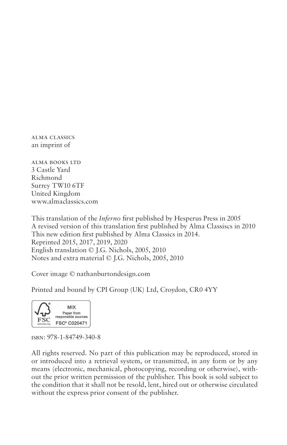 Inferno, the first part of Dante’s Comedy, is presented here in a new verse translation by acclaimed poet and prize-winning translator J.G. Nichols, together with the original text facing, extensive notes, illustrations and a critical apparatus focusing on the author’s life and works.