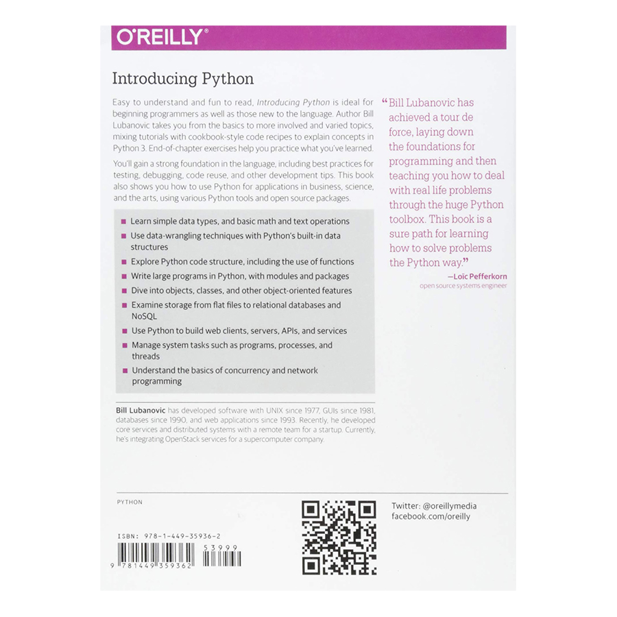 Easy to understand and fun to read, Introducing Python is ideal for beginning programmers as well as those new to the language. Author Bill Lubanovic takes you from the basics to more involved and varied topics, mixing tutorials with cookbook-style code recipes to explain concepts in Python 3. End-of-chapter exercises help you practice what you’ve learned.