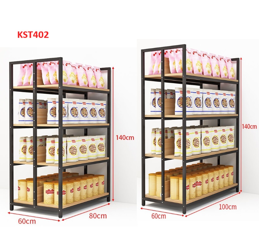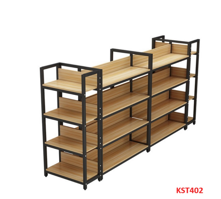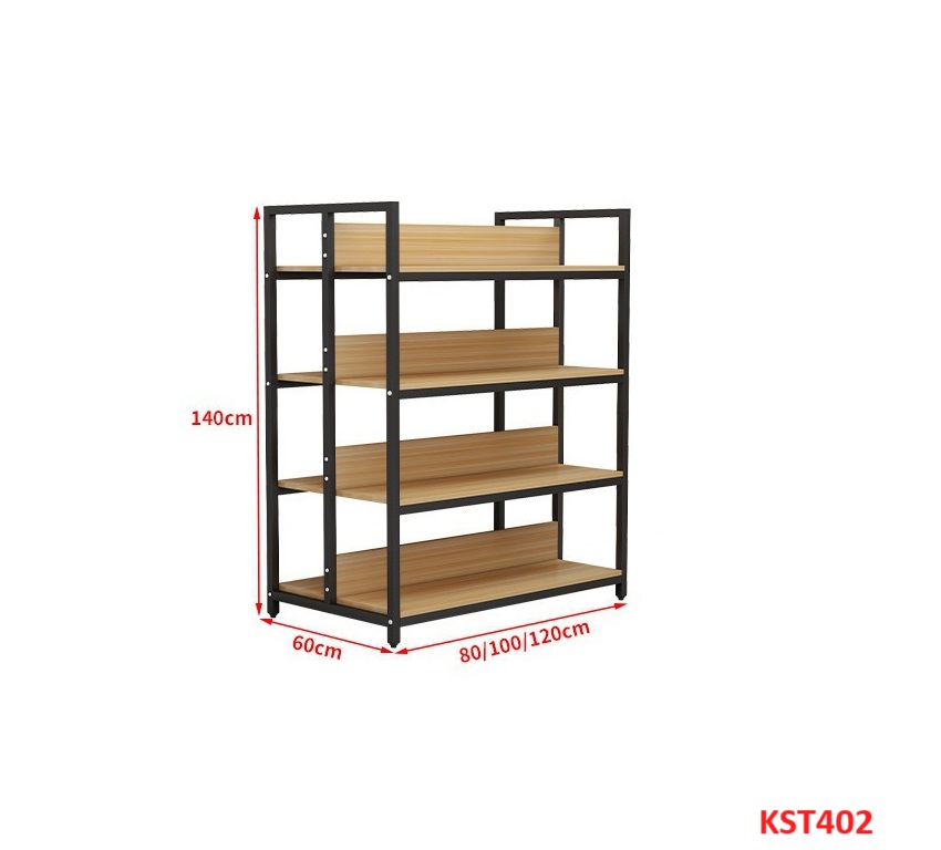 Kệ khung sắt mặt gỗ là một một loại kệ trưng bày hoặc để hàng hóa sản phẩm. Tuy nhiên, thay vì sử dụng mâm tole , thì các mẫu kệ này sẽ được sử dụng chất liệu gỗ MDF để làm mâm chứa hàng, kết hợp với khung sắt chắc chắn, thì mẫu kệ này là loại kệ để được rất nhiều loại đồ, và ứng dụng được trong rất nhiều nhu cầu của khách hàng như chứa đồ, trang trí, bán hàng…