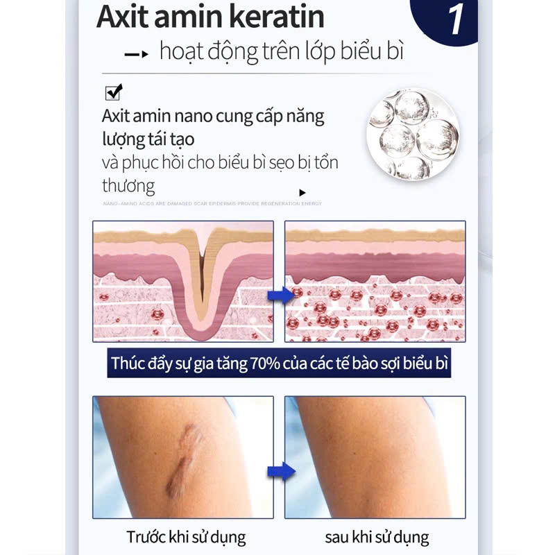 • Xóa mờ sẹo lồi – sẹo lõm lâu năm: Thành phần hoạt tính giúp làm mềm mô sẹo, hỗ trợ tái tạo tế bào da mới, trả lại làn da đều màu.