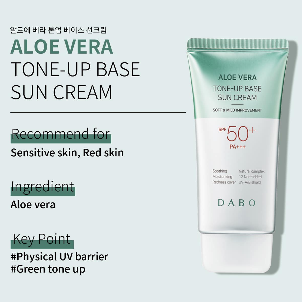 Mua tại TiktokKem chống nắng DABO Aloe Vera Tone Up với chỉ số chống nắng SPF50 PA+++ bảo vệ da khỏi tia UVA/UVB rất hiệu quả, tinh chất Lô hội tinh khiết kết hợp với Trà xanh (Camellia Extract), Rau má (Centella Asiatica)... Giúp cấp ẩm, kháng khuẩn, ngừa mụn, tái tạo tế bào da, cung cấp Vitamin mang lại da trắng hồng, mịn màng và khỏe mạnh. Kem nâng Tone cho lớp Make-Up tự nhiên. KCN sử dụng tốt cả ngoài trời hoặc trong nhà, hiệu quả đặc biệt với da khô.