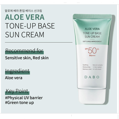 Công dụng: Kem chống nắng DABO Aloe Vera Tone Up với chỉ số chống nắng SPF50 PA+++ bảo vệ da khỏi tia UVA/UVB rất hiệu quả, tinh chất Lô hội tinh khiết kết hợp với Trà xanh (Camellia Extract), Rau má (Centella Asiatica)... Giúp cấp ẩm, kháng khuẩn, ngừa mụn, tái tạo tế bào da, cung cấp Vitamin mang lại da trắng hồng, mịn màng và khỏe mạnh. Kem nâng Tone cho lớp Make-Up tự nhiên. KCN sử dụng tốt cả ngoài trời hoặc trong nhà, hiệu quả đặc biệt với da khô.