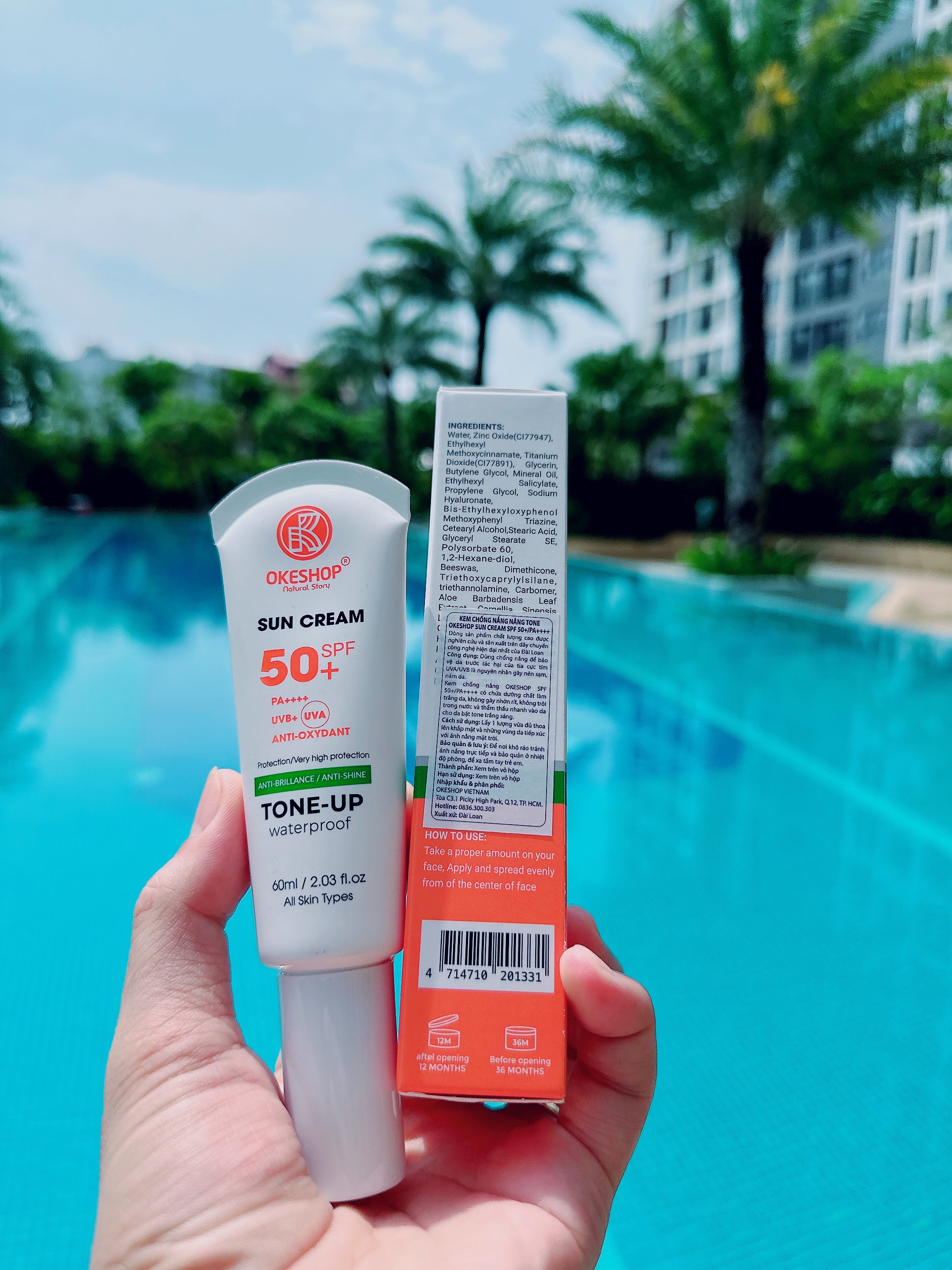 Thoải mái tận hưởng những chuyến du lịch ngoài trời mà không phải lo làn da bị đen sạm nữa, là sản phẩm chống nắng cho mọi loại da OKESHOP SPF 50+ PA++++ Anti-oxydant sẽ là lựa chọn tối ưa cho ngày hè sắp tới Chống nắng TONE-UP OKESHOP SPF 50+ PA++++ Anti-oxydant 60ml Ngày nay trên thị trường mỹ phẩm có vô vàn các sản phẩm kem chống nắng nếu vẫn chưa biết lựa chọn sản phẩm nào để sử dụng thì hãy thử dòng sản phẩm kem chống nắng nâng tông của OKESHOP chắc chắn đây sẽ là sản phẩm khiến bạn cảm thấy hài lòng. CÔNG DỤNG TONE-UP OKESHOP SPF 50+ PA++++ Anti-oxydant 60ml SUN CREAM OKESHOP SPF 50+ PA++++ Anti-oxydant 60ml giúp ngăn chặn 99% tia UV với chỉ số chống nắng cao SPF50+ PA++++ chống được tối đa tia UVA/UVB ngay cả khi bạn không trang bị cho mình đầy đủ áo, khẩu trang khi ra ngoài. OKESHOP SPF 50+ PA++++ Anti-oxydant 60ml giúp bảo vệ làn da của bạn an toàn dưới ánh nắng mặt trời mà vẫn dịu nhẹ, không gây hại cho da. Chỉ số SPF 50+ cho khả năng chống tia UVB trong thời gian dài bảo vệ làn da không bị cháy nắng, sạm đen. Chỉ số PA++++ ngăn chặn triệt để tia UVA - là tác nhân gây nên hiện tượng lão hóa da sớm như hình thành nếp nhăn, đốm nâu. SUN CREAM OKESHOP sẽ giúp nuôi dưỡng cho làn da bạn luôn ẩm mượt, gia tăng độ đàn hồi, chống oxi hóa, tăng cường sức khỏe cho da khỏe mạnh, bảo vệ da khỏi những tác động tiêu cực từ môi trường. Đồng thời, kem chống nắng còn bổ sung lượng nước, cấp ẩm dồi dào giúp làn da mềm mại, mượt mà hơn với chiết xuất dưỡng da từ thiên nhiên của hoa trà xanh, nha đam, hắc mai biển mang lại cho các nàng một cảm giác thoải mái dịu nhẹ thanh mát trong cả ngày dài Một điểm cộng của TONE-UP OKESHOP SPF 50+ PA++++ Anti-oxydant 60ml nữa đó chính là khả năng chống thấm nước, mồ hôi và kể cả lượng dầu nhờn tiết ra trên da nên chúng ta không phải lo lắng lớp kem chống nắng sẽ bị trôi mất. Cũng chính vì tính năng thẩm thấu sâu vào bên trong bề mặt da nhanh chóng nên đây sẽ là sản phẩm lý tưởng để sử dụng mỗi khi đi tắm biển, bơi lội hay tiếp xúc môi trường nước. HƯỚNG DẪN SỬ DỤNG: