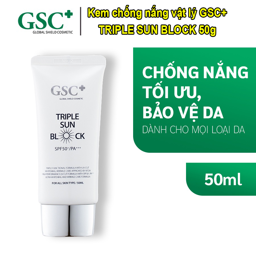 - TRIPLE SUN BLOCK 50g Kem chống nắng GSC Triple Sun Block Hàn Quốc là một trong những sản phẩm kem chống nắng vật lý. Sản phẩm được chị em phụ nữ tin dùng nhiều nhất tại Việt Nam. Kem chống nắng chứa thành phần lành tính và chỉ số chống nắng cao. Giúp bảo vệ làn da khỏi tác hại của các tia UVA/UVB, chống lão hóa. Phù hợp với mọi loại da, kể cả da nhạy cảm