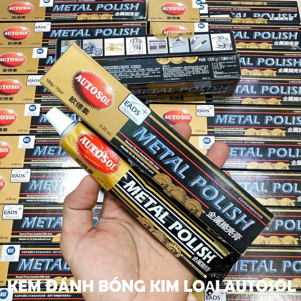 Mua tại TiktokKem đánh bóng kim loại Autosol là sản phẩm chuyên dụng giúp làm sạch và làm sáng bóng inox, nhôm, đồng, crom... nhanh chóng và hiệu quả. Đặc biệt phù hợp cho các chi tiết kim loại trên xe máy, ô tô, xe cổ, đồ gia dụng hoặc vật dụng kim loại trang trí. Với công thức đặc biệt từ Đức, Autosol không chỉ làm bóng mà còn bảo vệ bề mặt khỏi oxy hóa, hoen ố và gỉ sét lâu dài. Ưu điểm nổi bật:
