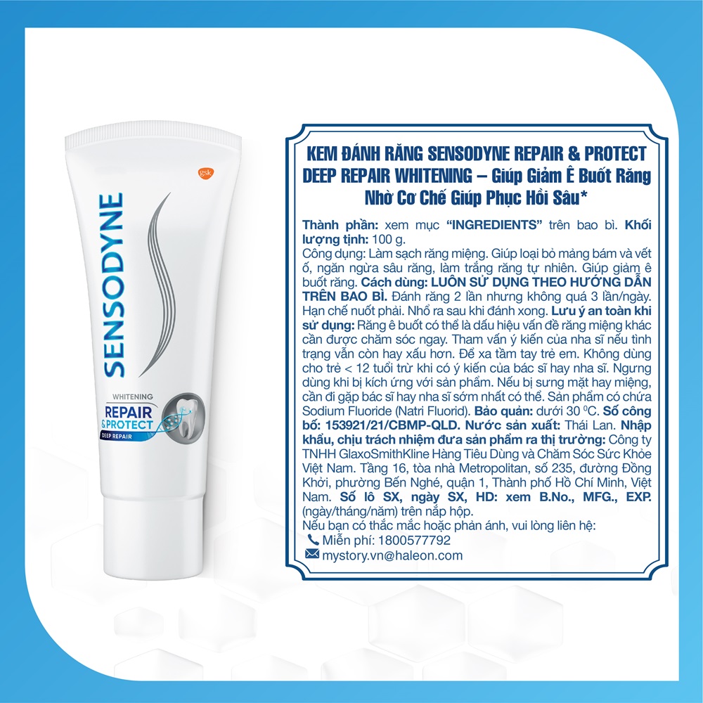 - Kem Đánh Răng Sensodyne Repair & Protect Deep Repair Whitening 100g giúp phục hồi răng nhạy cảm, giảm ê buốt, ngừa sâu răng và bảo vệ răng nhạy cảm.