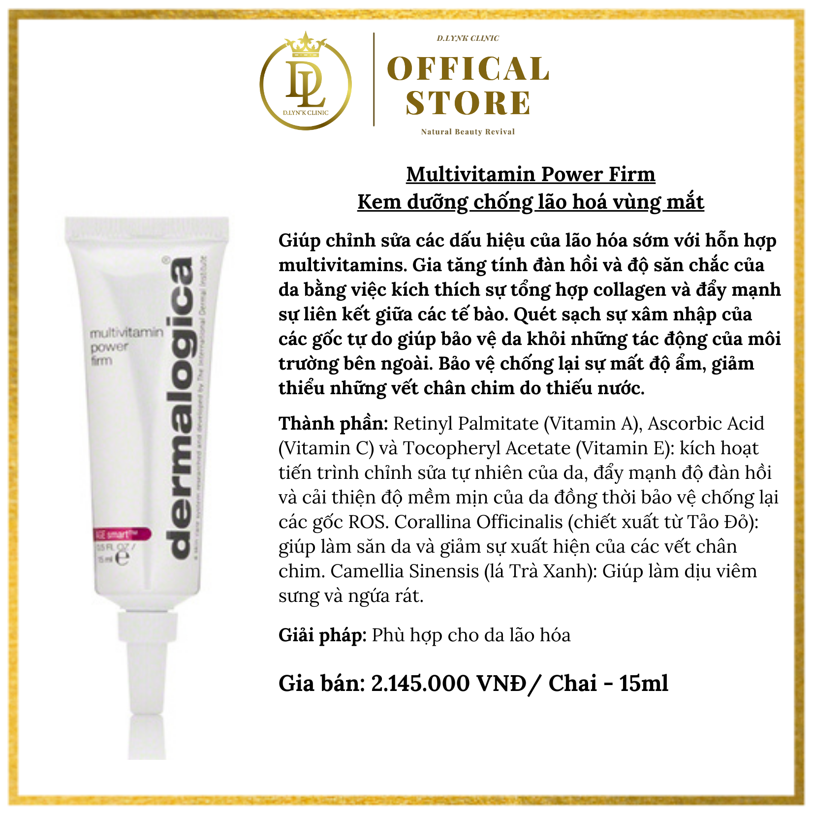 Kem dưỡng chống lão hóa vùng mắt Dermalogica Multivitamin Power Firm 15ml Multivitamin Power Firm giúp chỉnh sửa các dấu hiệu của lão hóa sớm với hỗn hợp MultiVitamin. Gia tăng tính đàn hồi và