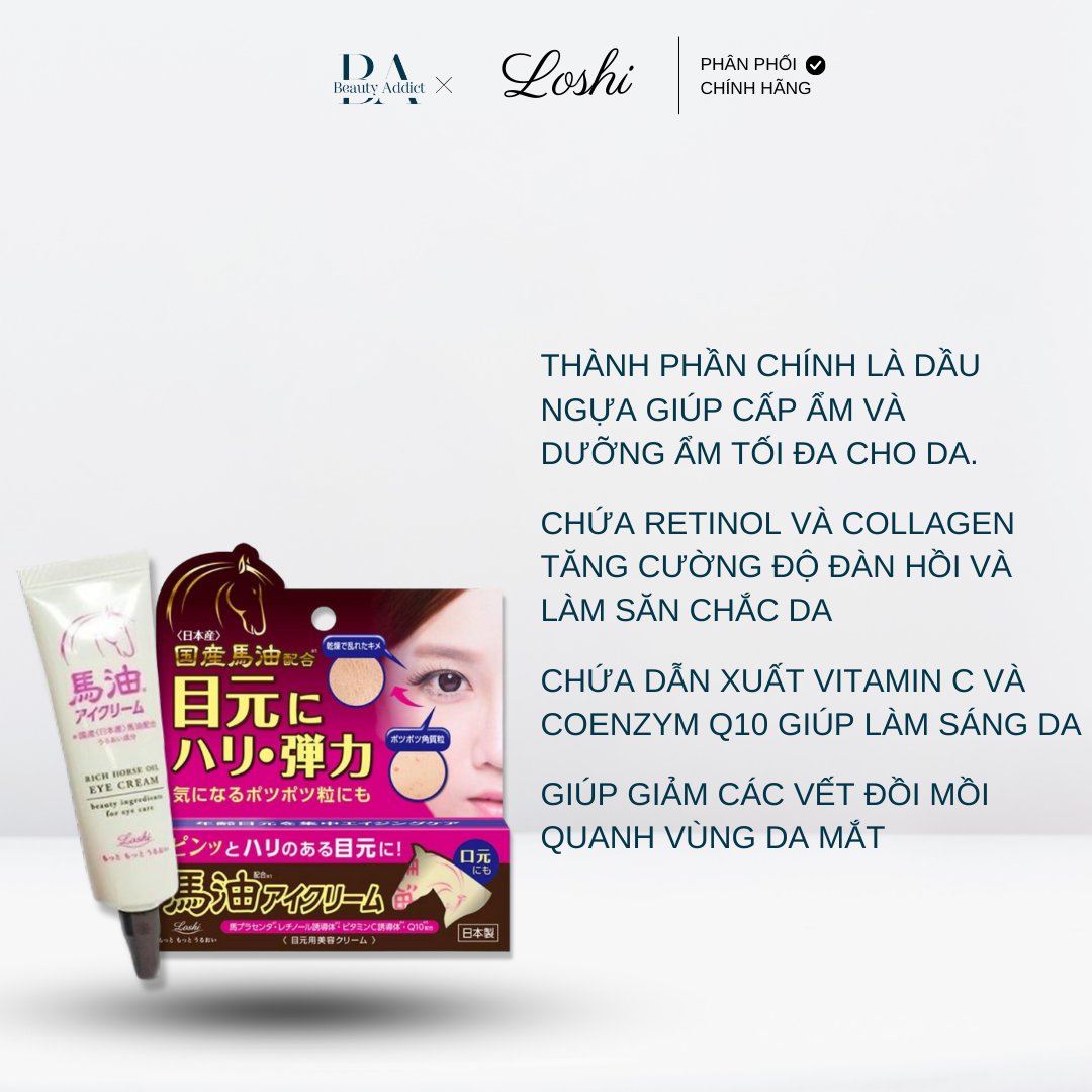 Bạn có biết, vùng da dễ bị lão hóa nhất trên gương mặt chính là vùng da mắt hay không? Đặc biệt với độ tuổi từ 30 trở lên, các tác động từ môi trường dẫn đến tình trang khô da và xuất hiện tàn nhang, đồi mồi ở vùng da này rất dễ xảy ra! Chính vì vậy sản phẩm kem dưỡng mắt dầu ngựa Loshi chính là giải pháp cứu cánh cho bạn, giúp bạn cải thiện độ săn chắc và đàn hồi vùng da mắt một cách nhanh chóng! Khả năng dưỡng mạnh mẽ của sản phẩm đến từ một bảng thành phần tối ưu bao gồm: