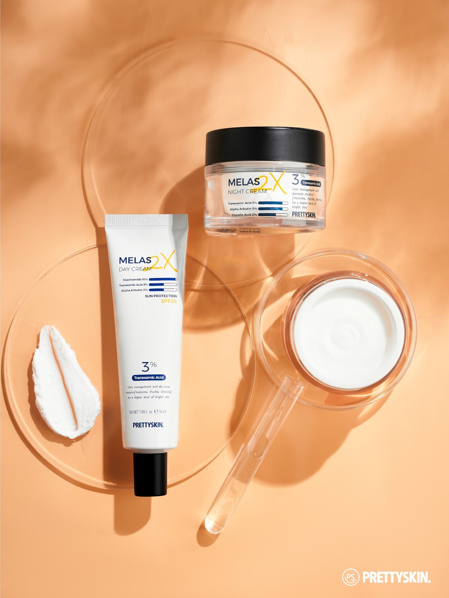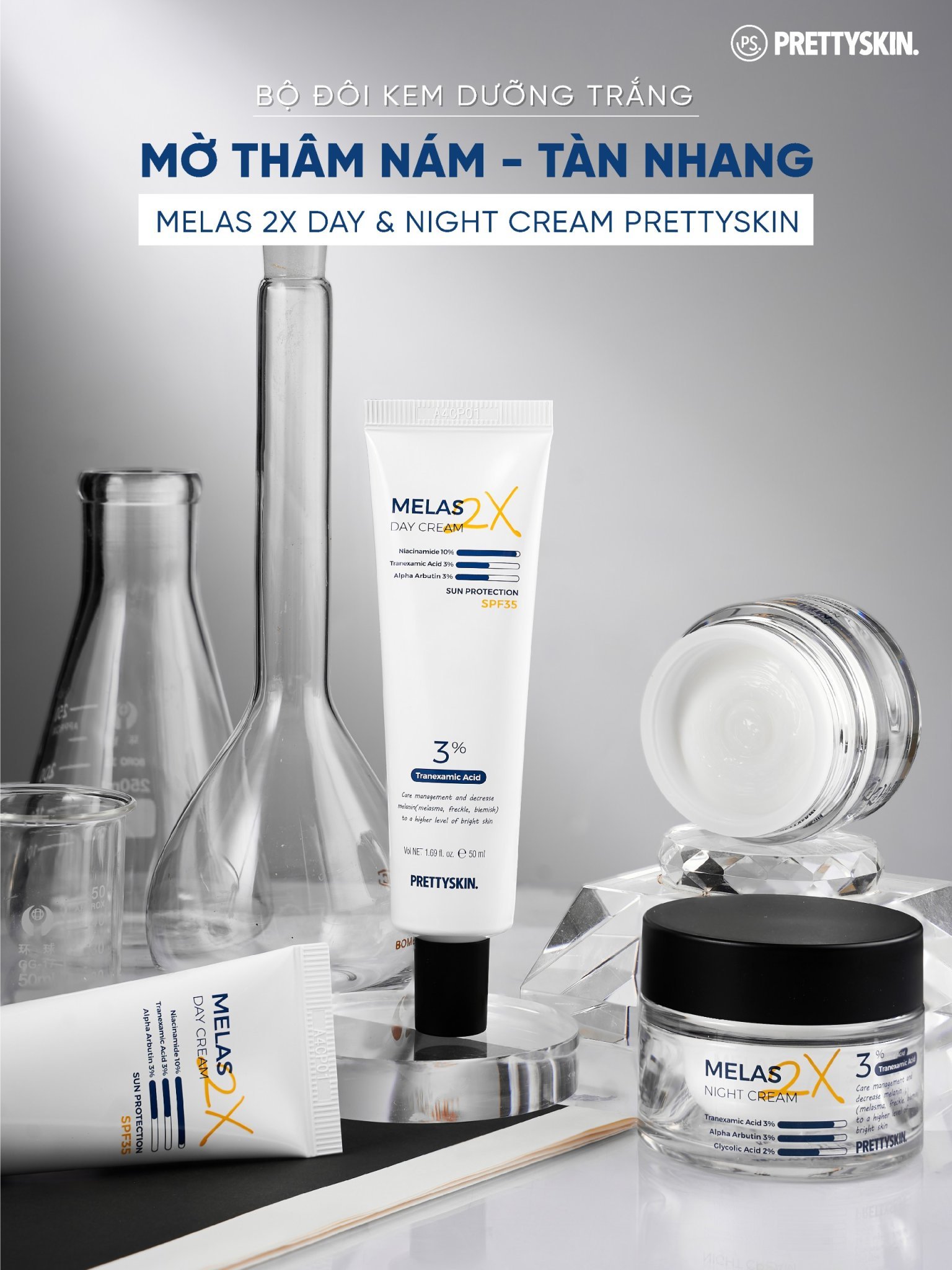 Sự kết hợp của 3% cùng với 3% là điểm nhấn ấn tượng có trong bộ đôi kem dưỡng ngày đêm Melas 2X mới nhà Prettyskin mang lại hiệu quả làm sáng da và làm mờ các vết thâm nám.