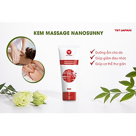 KEM MASSAGE JAVI'E NANOSUNNY   Công dụng: Kem massage JAVI'E NANOSUNNY, giúp dưỡng ẩm cho da, mang lại làn da mềm mại đồng thời giúp cơ thể thư giãn. Thành phần: Aqua, Methyl Salicylate, Menthol, Glycerin, Stearyl Alcohol, Cetyl Alcohol, Paraffinum liquidum, Camphor, Sodium lauryl sulfate, Cinnamomun Zeylancium leaf oil, Phenoxyethanol, Ethylhexyglycerin. Hướng dẫn sử dụng: Sử dụng kem Massage NanoSunny bôi ngoài da. Massage lên vùng đau nhức. Bảo quản: Để nơi khô ráo thoáng mát, đậy nắp kín sau khi sử dụng. Tránh ánh nắng mặt trời. Lưu ý: Không dùng cho vết thương hở, không được nuốt hoặc xoa lên mắt. Số công bố: 005534/20/CBMP-HCM Khi cơ thể mệt nhoài, nhức mỏi, bạn hãy sử dụng Kem massage JAVI'E NANOSUNNY, giúp cơ thể thư giãn, cho bạn cảm giác ấm áp nhẹ nhàng, xoa dịu đau nhức.