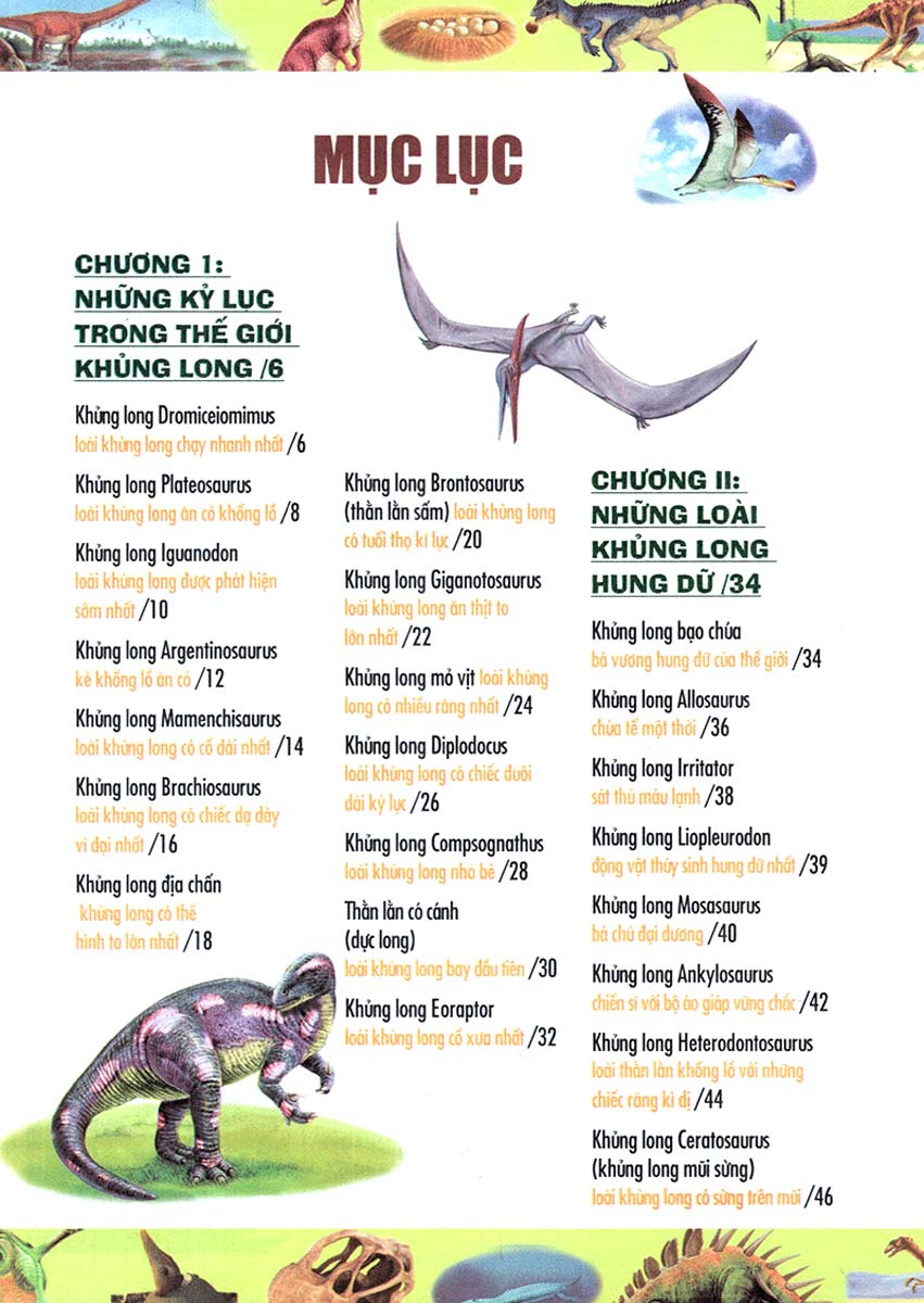 Trong gia tộc khủng long có nhiều loài khiến chúng ta kinh ngạc. Khủng long Argentinosaurus là loài có kích thước cơ thể lớn nhất với chiều dài 45m, cao tương đương với tòa nhà 8 tầng, trọng lượng tương đương với tổng trọng lượng hơn 20 con voi cộng lại, khi di chuyển thường khiến mặt đất rung chuyển dữ dội. Khủng long Mamenchisaurus nổi tiếng với chiếc cổ dài kỉ lục bằng nửa kích thước cơ thể. Khủng long sấm Brontosaurus là loài có tuổi thọ cao nhất, chúng có thể sống hơn 200 tuổi. Khủng long bạo chúa hung dữ có thể nuốt trọn một con bò, sư tử ngày nay không thể là đối thủ của chúng. Nếu muốn khám phá thêm những điều thú vị về khủng long, bạn hãy đọc cuốn sách này.