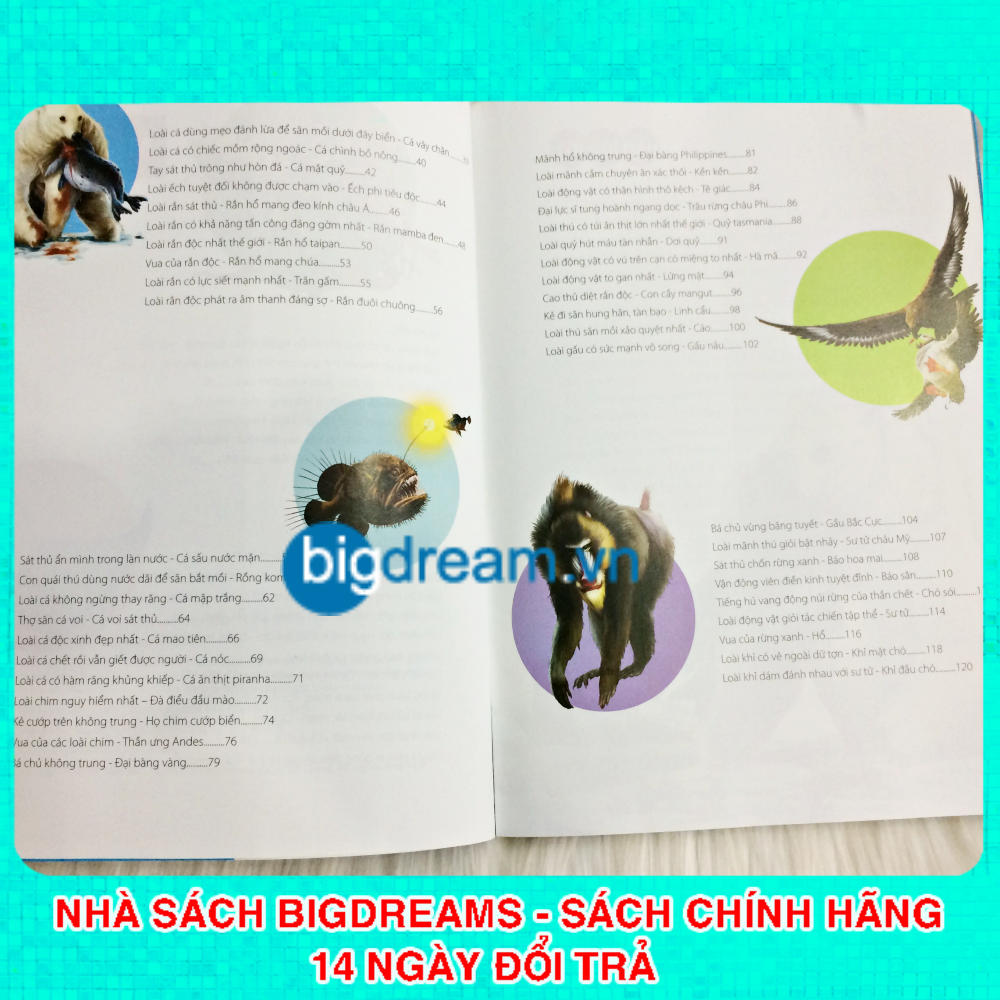 Sách - Khám Phá Thế Giới Động Vật Kì Thú - Thế giới của những loài động vật sát thủ - Kiến thức bách khoa cho trẻ Giới thiệu sơ lược hình thức và nội dung: Sách khoa học phổ biến kiến thức về động vật phù hợp cho các bạn nhỏ từ 3 tuổi đam mê khám phá thế giới xung quanh Sách giới thiệu nhiều loài động vật độc đáo, đại diện cho các chi họ động vật khác nhau từ thời tiền sử đến nay Khám Phá Thế Giới Động Vật Kì Thú - Thế giới của những loài động vật sát thủ như một bảo tàng động vật với các loài vật săn mồi hàng đầu... Sách phân loại một cách khoa học, giới thiệu chi tiết về đặc điểm ngoại hình, tập tính, phân bố của từng loại động vật, phù hợp với nhu