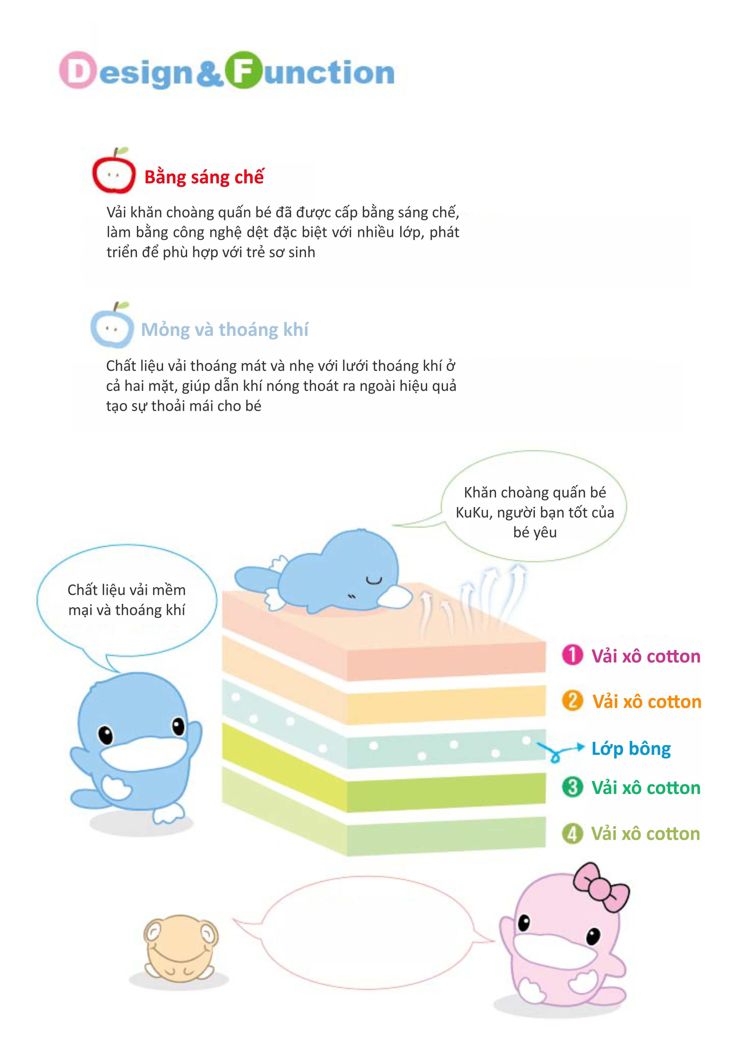Họa tiết bông hoa được đính trên nền vải gấm khổ lớn ba lớp. Gạc ba mềm và nhẹ sử dụng sợi hữu cơ nhẹ nhàng quấn bé. Ngoài khả năng thoáng khí và hút nước