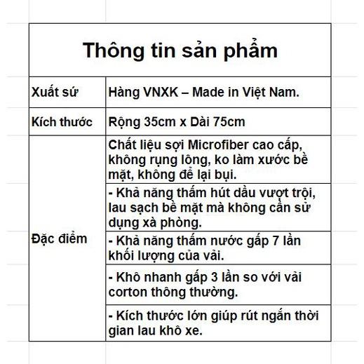 Mua tại Tiktok– Xuất Xứ: Hàng Chuẩn VNXK – Made in Việt Nam. – Kích thước: Rộng 35cm x Dài 75cm. – Chất liệu: Sợi Microfiber cao cấp, không rụng lông, ko làm xước bề mặt, không để lại bụi. Thấm hút siêu tốt.