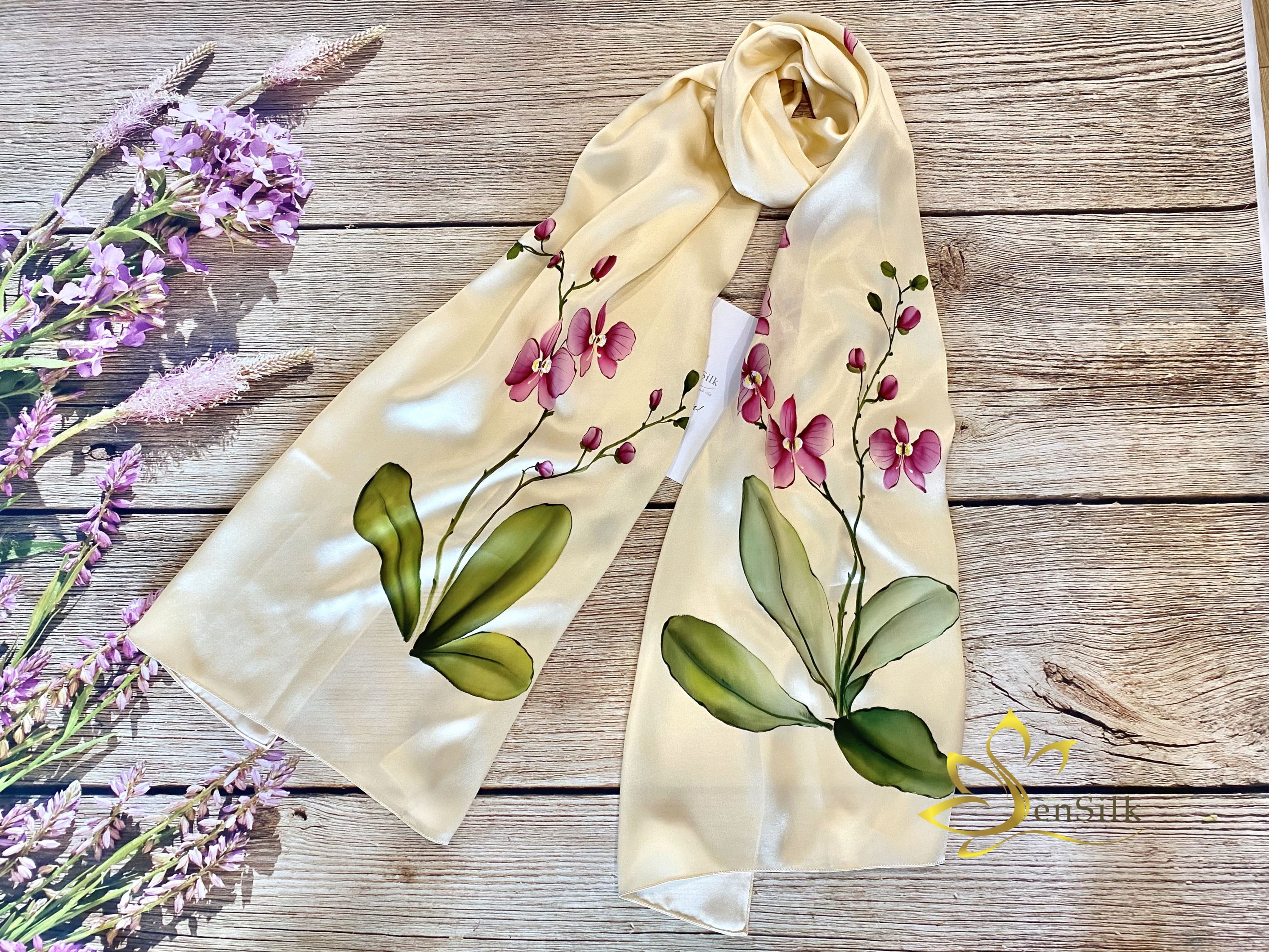 Khăn Lụa Tơ Tằm Vẽ Tay Hoa Lan SenSilk mang sắc đẹp và hương thơm của một loài hoa quý tộc, chúng có đầy đủ sự kiêu sa, đài cát và quý phái của một bậc vương giả! Hoa Lan cũng là món quà tết hết sức ý nghĩa cho các gia đình Việt.