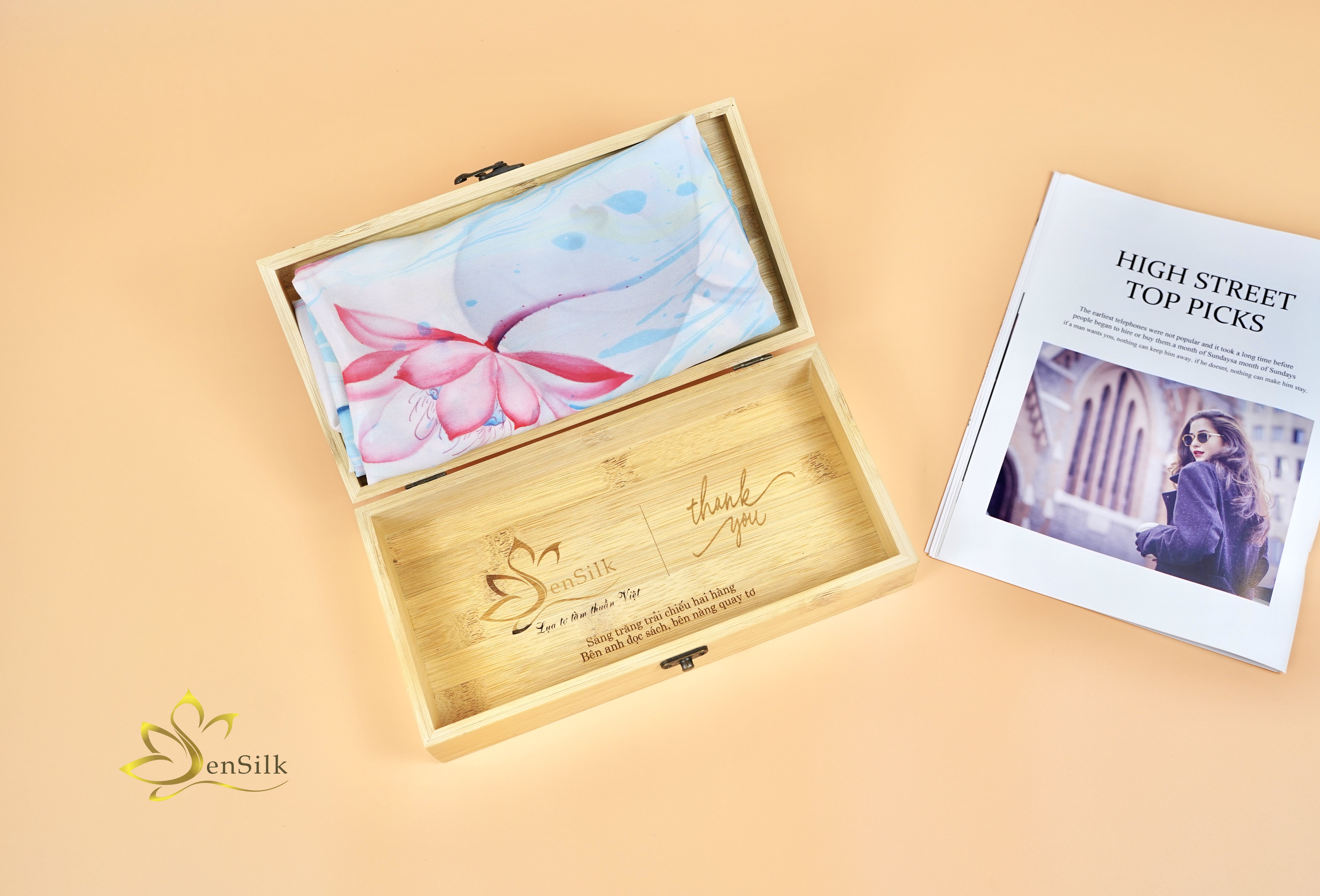 Nét chấm phá của Bộ sản phẩm Lụa Thủy Ấn còn nằm ở chiếc hộp đựng làm trừ Tre. Hộp Tre SenSilk được thiết kế độc đáo, chau chuốt về ý tưởng tạo nên một sản phẩm nghệ thuật làng nghề mộc mạc, tinh xảo và thân thiện với môi trường. Riêng chiếc hộp thôi cũng là một món quà vô cùng thi vị cho các Nàng Thơ.
