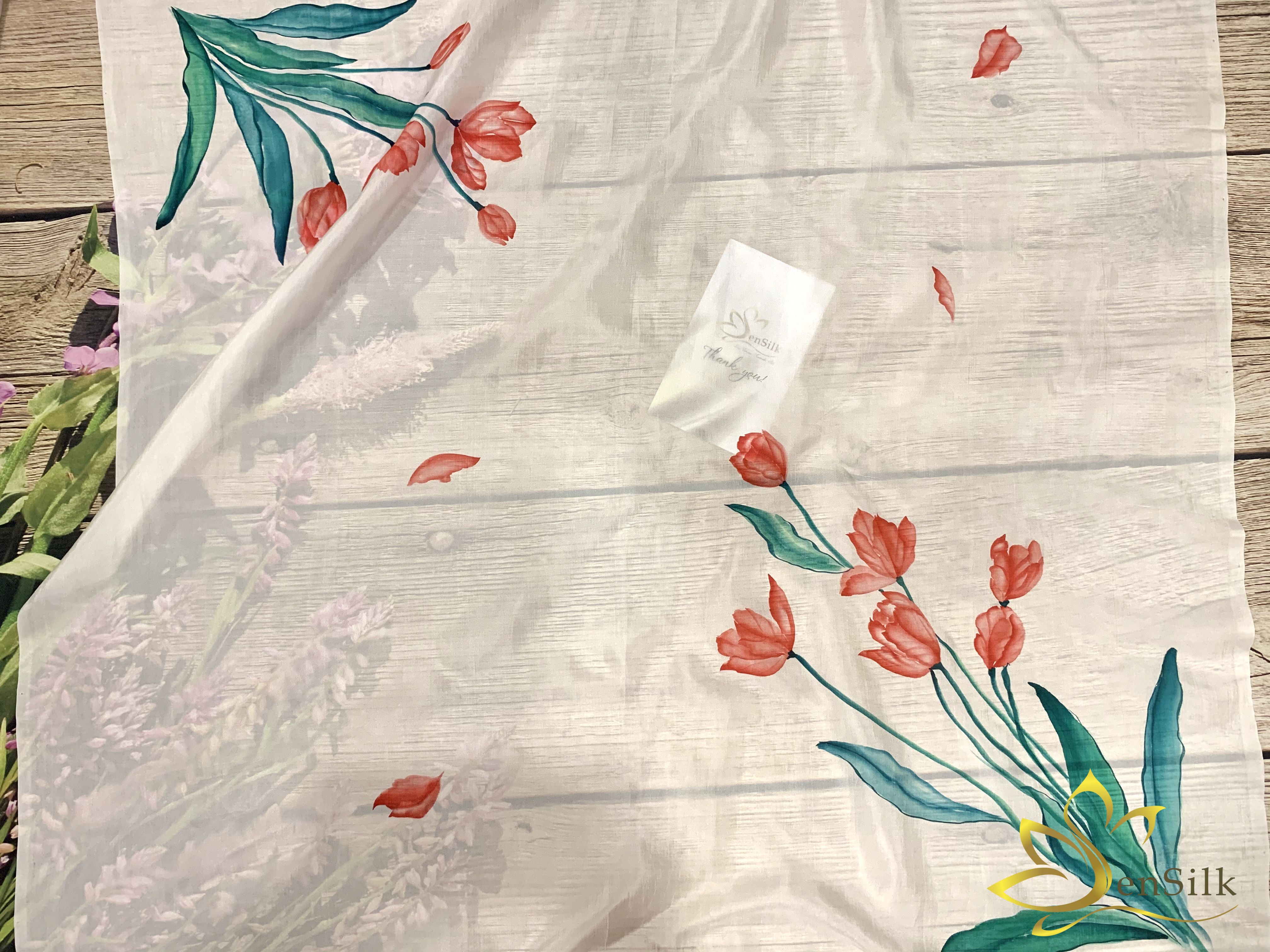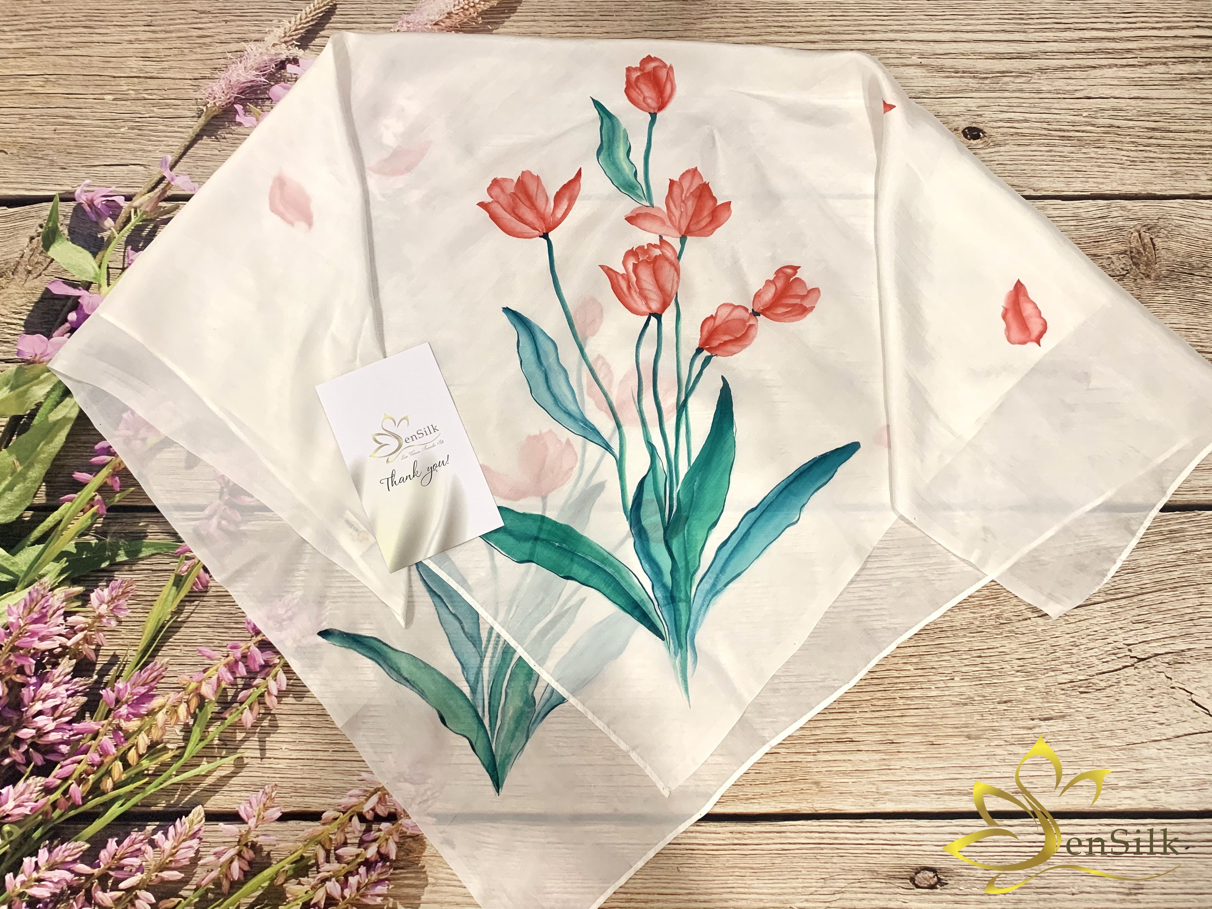 ✨Khăn Lụa Vuông Cao Cấp Vẽ Tay Hoa Tulip – SenSilk, Quà Tặng Đối Tác