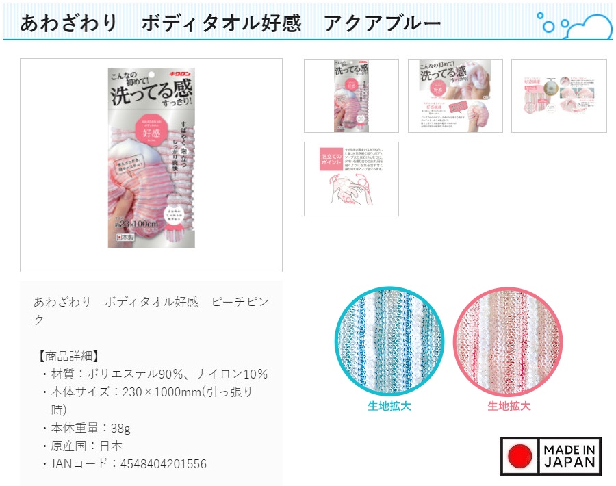 Khăn tắm kỳ lưng cao cấp Kikulon Azawari THÔNG TIN SẢN PHẨM Xuất xứ: Nhật Bản - Màu sắc: • 20155 màu hồng | Kích thước: rộng 23 x dài 100cm • 20156 màu