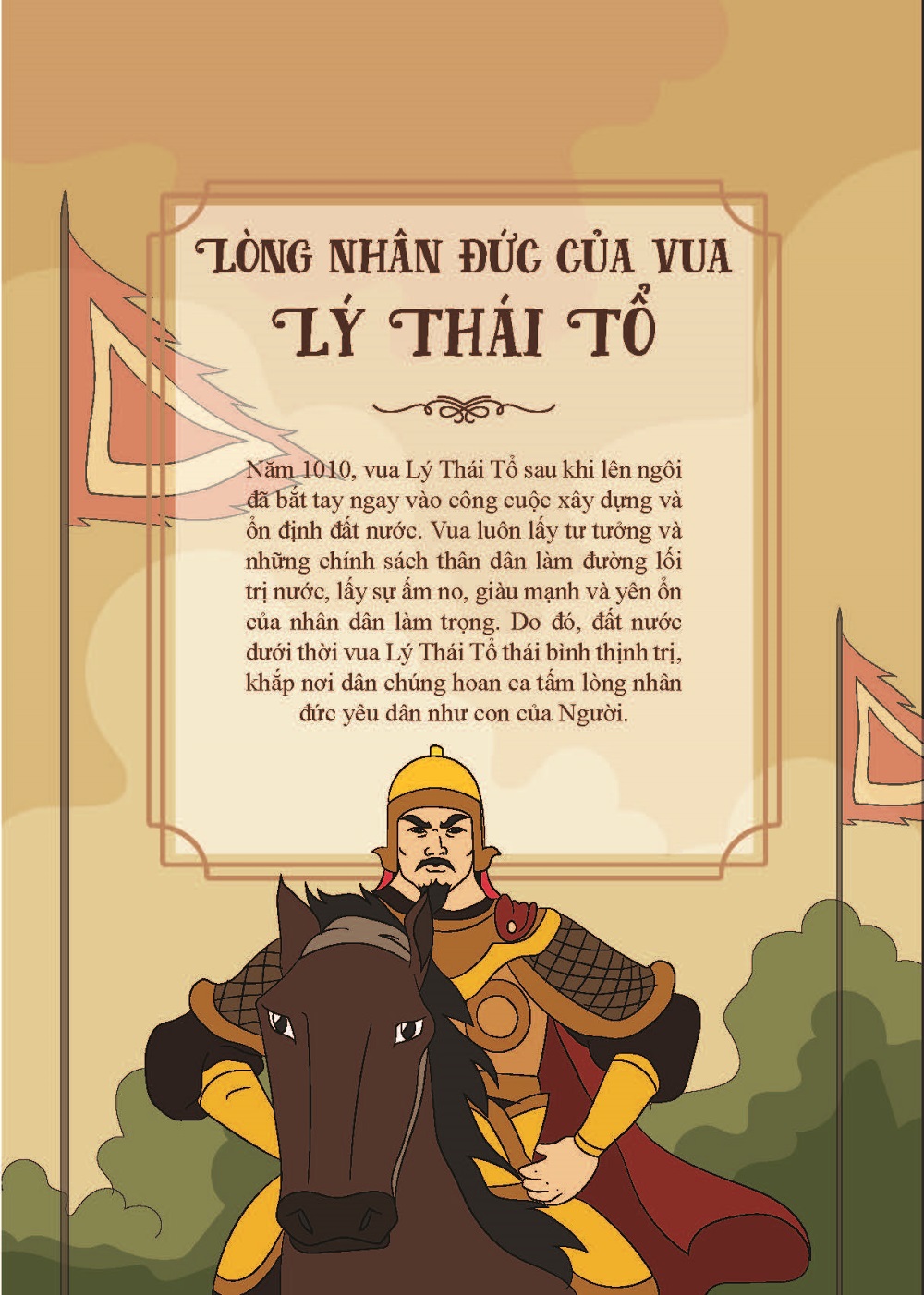 Bộ sách “Truyện tranh lịch sử Việt Nam – Khát vọng non sông” gồm hàng trăm tập, giới thiệu ngắn gọn, sinh động những truyền thuyết đầy tính nhân văn và những sự kiện, những nhân vật nổi tiếng trong lịch sử hàng nghìn năm của dân tộc Việt Nam. Lòng nhân đức của vua Lý Thái Tổ – Năm 1010, vua Lý Thái Tổ sau khi lên ngôi đã bắt tay ngay vào công cuộc xây dựng và ổ định đất nước. Lấy tư tưởng và những chính sách thân dân làm đường lối trị nước, lấy sự ấm no, giàu mạnh và yên ổn của nhân dân làm trọng, vua Lý Thái Tổ đã đưa nước Đại Việt ngày càng phồn thịnh.