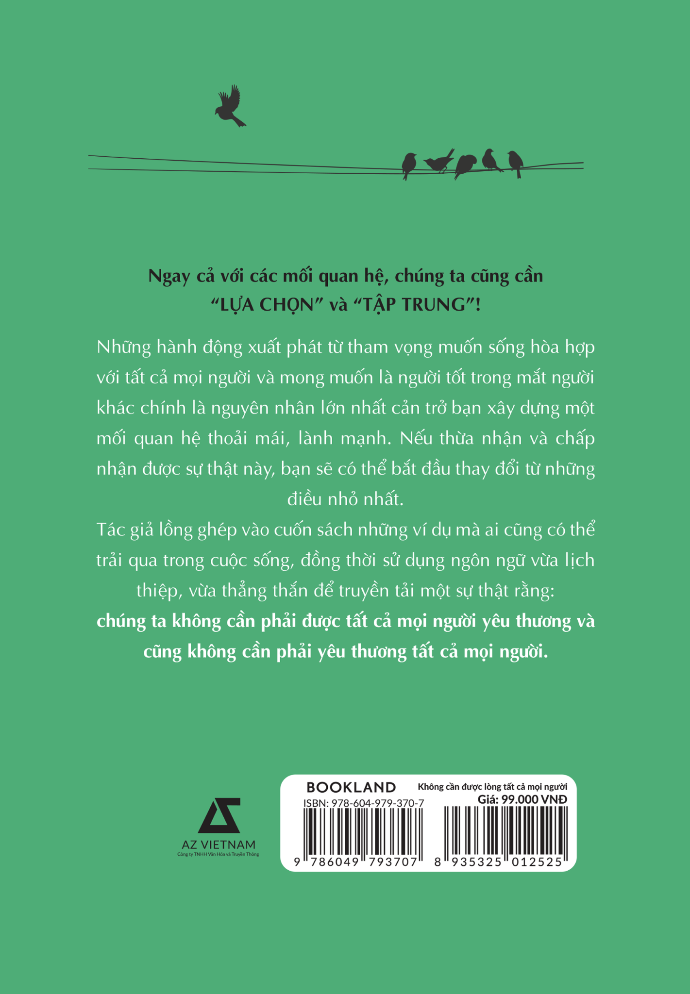 Đúng như tên gọi “Không cần được lòng tất cả mọi người”, thông điệp được tác giả truyền tải xuyên suốt cuốn sách là: bạn không cần được tất cả mọi người yêu thương và cũng không cần phải yêu thương tất cả mọi người.