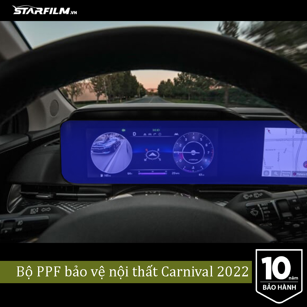 Tấm dán PPF TPU STAR FILM Tấm dán PPF (Pain protection film) được thiết kế cho việc che phủ và bảo vệ lớp sơn xe và nội thất trong ô tôVới ưu điểm vượt trội khi dùng nguyên vật liệu gốc là high polymer TPU, tấm dán có khả năng tự hồi phụ các vết xước nhỏ và có khả năng biến dạng tốt, phù hợp bao phủ các bề mặt cong, phức tạp.Ngoài ra tấm dán có thể dễ dáng bóc ra thay thế mới và không ảnh hưởng dến lớp sơn của xe, giữ lớp sơn xe nguyên bản. Độ bền vượt trội so với các loại tấm dán khác, giữ được khả năng trong suốt từ 5 năm đến 10 năm tùy theo điều kiện sử dụng Bộ sản phẩm thiết kế cho model KIA CARNIVAL 2022 bao gồm