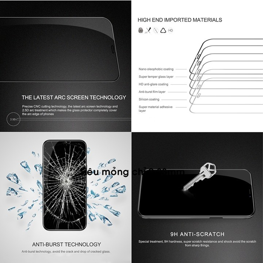 Dán cường lực 2.5D chống bể màn hình Độ trong suốt đạt chuẩn HD, chống dầu, chống chói Độ cứng 9H chịu lực tốt hơn miếng dán thường Cạnh viền được vát cong, hạn chế