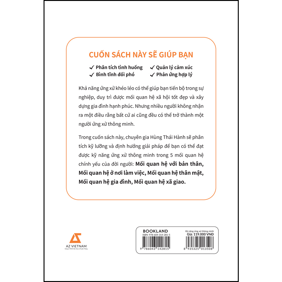 Để giúp bạn đạt được điều này, chuyên gia phân tích các mối quan hệ Hùng Thái Hành đã tập hợp những bài học giao tiếp thiết thực nhất trong cuốn sách “Kỹ năng ứng xử thông minh”. Ở đây, bạn sẽ học được cách tạo dựng và bồi dưỡng 5 mối quan hệ chính yếu của đời người: Mối quan hệ với bản thân - Mối quan hệ ở nơi làm việc - Mối quan hệ thân mật - Mối quan hệ gia đình - Mối quan hệ xã giao.