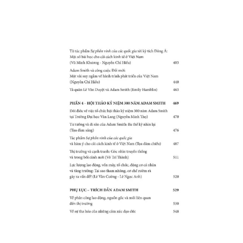 Cùng với đó là phần Phụ lục trích dịch 2 tác phẩm quan trọng nhất của ông - Sự phồn vinh của các quốc gia và Lý thuyết về tình cảm đạo đức. Trong gần 600 trang sách, các tác giả đã phác họa lại cuộc đời, bối cảnh lịch sử thời Adam Smith sinh sống, những yếu tố góp phần hun đúc nên tư tưởng quan trọng của ông; bên cạnh đó, các tác giả đã phóng chiếu, bàn sâu về sự ảnh hưởng của ông lên lý thuyết kinh tế thế giới, cho thấy tư tưởng vượt thời cùng những cấp tiến bên trong bộ óc lỗi lạc.