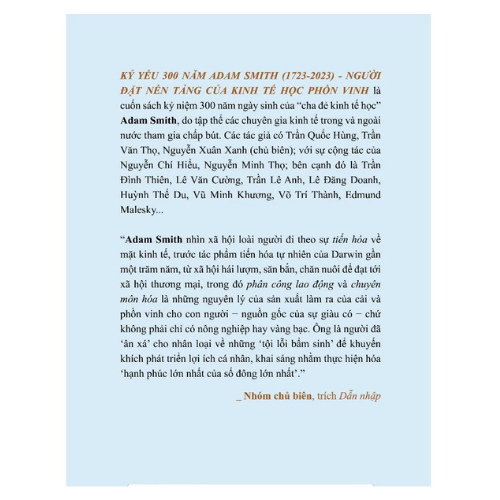 Kỷ yếu 300 năm Adam Smith (1723-2023) - Người đặt nền tảng của kinh tế học phồn vinh là cuốn sách được ra đời để kỷ niệm 300 năm ngày sinh của “cha đẻ” kinh tế học hiện đại Adam Smith (1723-2023), do Phanbook và NXB Đà Nẵng ấn hành. Đây là quyển sách đầu tiên về diện mạo và những đóng góp của ông cho lý thuyết kinh tế thế giới, do Trần Quốc Hùng - Trần Văn Thọ - Nguyễn Xuân Xanh chủ biên, với sự cộng tác, tham gia chấp bút của Nguyễn Chí Hiếu - Nguyễn Minh Thọ - Trần Lê Anh - Nguyễn Ngọc Anh - Nguyễn Tú Anh - Lê Văn Cường - Lê Đăng Doanh - Huỳnh Thế Du - Edmund Malesky - Emily Hamblin - Vũ Minh Khương - Hoàng Hải Vân…