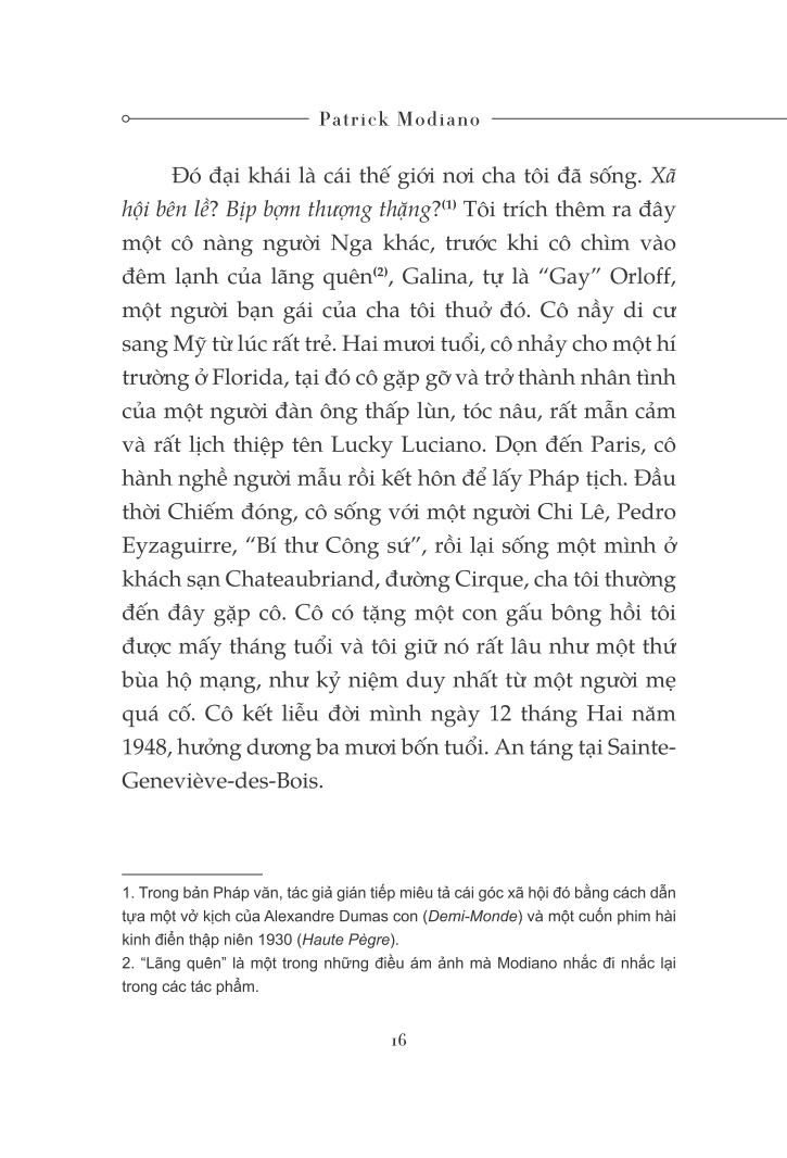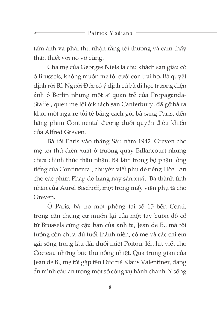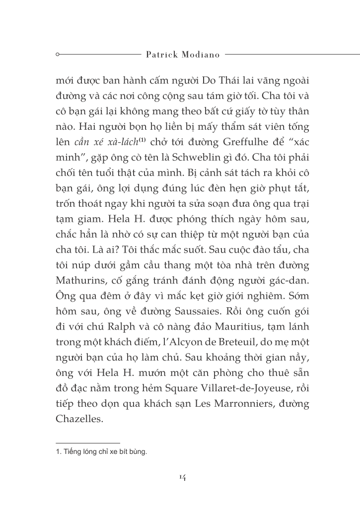Patrick Modiano, sinh năm 1945 tại Pháp, có cha là người Ý gốc Do Thái, mẹ là nghệ sĩ người Bỉ. Patrick Modiano được coi là một trong những nhà văn tài năng nhất thế hệ của ông. Là nhà thám hiểm quá khứ, ông biết cách khơi gợi lên một cách vô cùng chính xác và chi tiết bầu không khí của những địa điểm hay những thời đại đã qua, ví dụ như Paris thời bị Đức chiếm đóng.