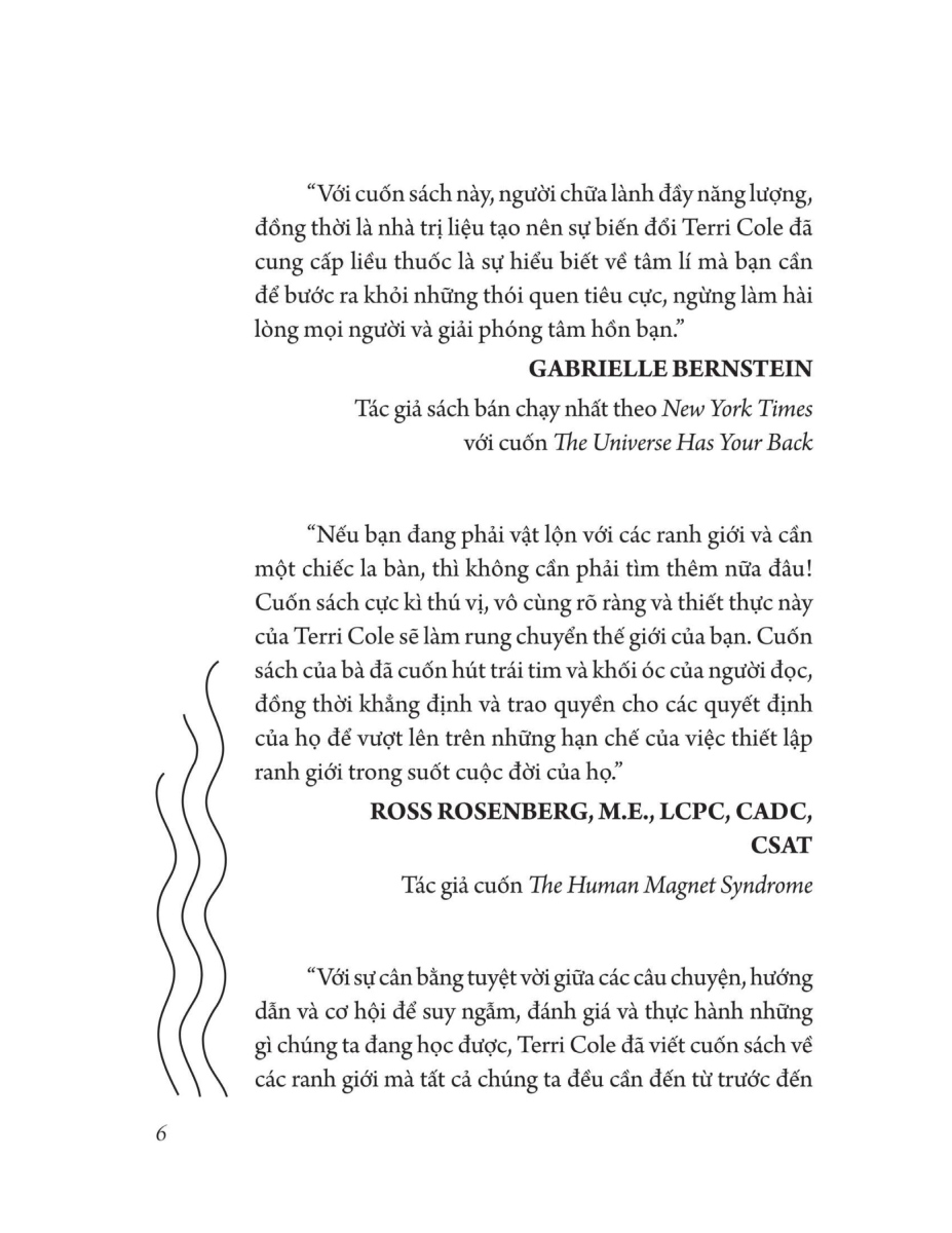Sức khỏe tinh thần và sự an toàn cảm xúc của bạn là trách nhiệm mà bạn cần gánh vác, và nó phải luôn là ưu tiên cao nhất. Dù cần nhiều thời gian làm chủ ranh giới, nhưng việc học cách thiết lập và củng cố chúng thì nhanh chóng hơn. Nếu bạn đi đúng gướng, bạn sẽ có các kĩ năng và sự hiểu biết để làm điều đó. Bạn sẽ loại bỏ được một cách có hệ thống những thông tin sai lệch làm ảnh hưởng đến hành vi về ranh giới của mình. Bạn sẽ biến đối được các suy nghĩ quen thuộc và đặt nền móng cho những thay đổi tích cực, đem đến sự hài lòng, bền vững, tự tin và bình yên cho mọi mối quan hệ cũng như cuộc sống của bạn theo cách mà bạn mong muốn.