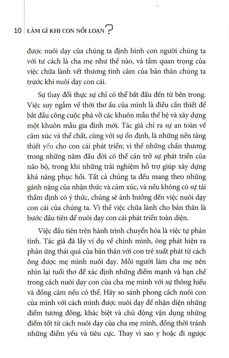 Cuốn sách phân tích sâu sắc về tầm quan trọng của việc cha mẹ tự phản tỉnh và thay đổi để đáp ứng nhu cầu phát triển của con cái. Tác giả khuyến khích sự tự nhìn lại của từng người về tuổi thơ để nhận diện những mặt mạnh và hạn chế trong cách nuôi dạy, từ đó xây dựng mối quan hệ tôn trọng và tin cậy giữa cha mẹ và con cái.