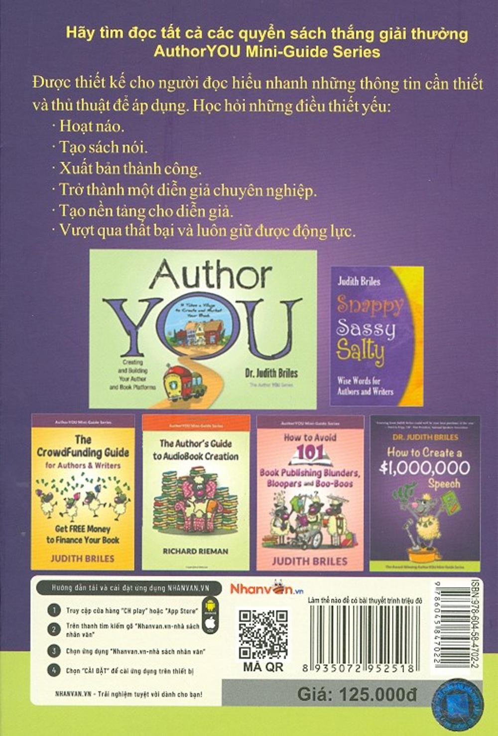 Nếu bạn từng muốn trở thành một chuyên gia về nghệ thuật thuyết trình, bạn phải mua quyền Làm thế nào để có bài thuyết trình triệu đô của Judith Briles. Nội dung, chiến lược, và phương pháp của cô chính là bí quyết cho việc nói chuyện thành công. Một tác giả có sách bán chạy, rất thành công của New York Times, một thiên tài xây dựng AuthorYOU và là diễn giả xuất chúng, Judith không "học" quá trình mà cô ta sống với nó. Trong quyền sách này, cô ta chia sẻ cách biến những cơn ác mộng trở thành những bài nói chuyện thăng hoa, nếu bạn đi theo hành trình này, bạn cũng có thể làm được. Giá như tôi có quyển sách này khi mới bắt đầu công việc diễn thuyết của m.ình,