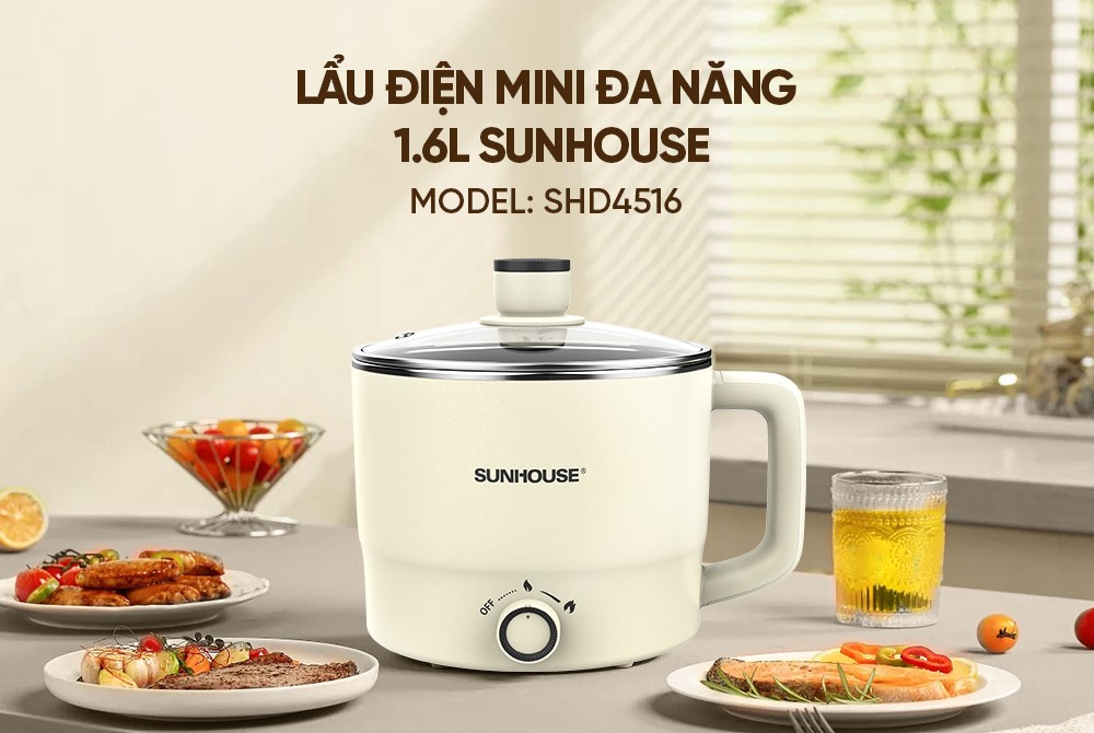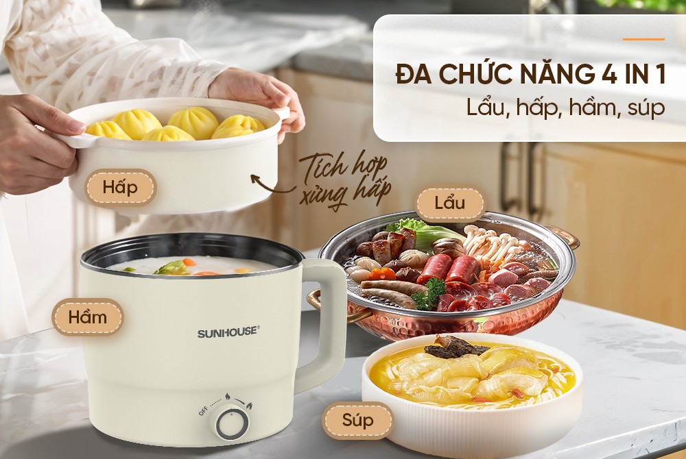 Nồi lẩu mini đa năng 1.6L Sunhouse SHD4516 là thiết bị nhà bếp đa năng, nhỏ gọn, phù hợp cho những bữa ăn nhanh gọn, tiện lợi. Không chỉ dùng để nấu lẩu, sản phẩm còn có thể hấp thực phẩm, làm món hầm, làm súp… đáp ứng nhu cầu nấu nướng đa dạng trong không gian bếp hiện đại. Thiết kế nhỏ gọn – Tiện lợi mọi không gian