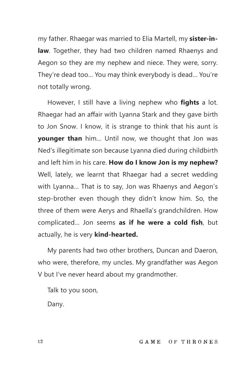 - Giới thiệu gia đình theo phong cách “xung đột” kiểu Game Of Thrones: “I still have a living nephew who fights a lot.”