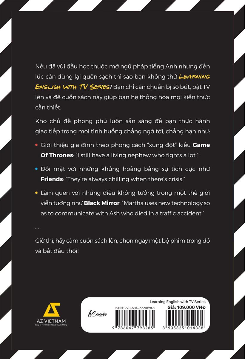 Mua tại TiktokLearning English With Tv Series - Luyện Nói Thành Thạo Cùng “Mọt” Phim Tiếng Anh Nếu đã vùi đầu học thuộc mớ ngữ pháp tiếng Anh nhưng đến lúc cần dùng lại quên sạch thì sao bạn không thử Learning English with TV Series? Bạn chỉ cần chuẩn bị sổ bút, bật TV lên và để cuốn sách này giúp bạn hệ thống hóa mọi kiến thức cần thiết. 9 bộ phim tương ứng với 9 chủ đề thông dụng luôn sẵn sàng để bạn thực hành giao tiếp dễ dàng trong mọi tình huống ngoài đời thực, chẳng hạn như: