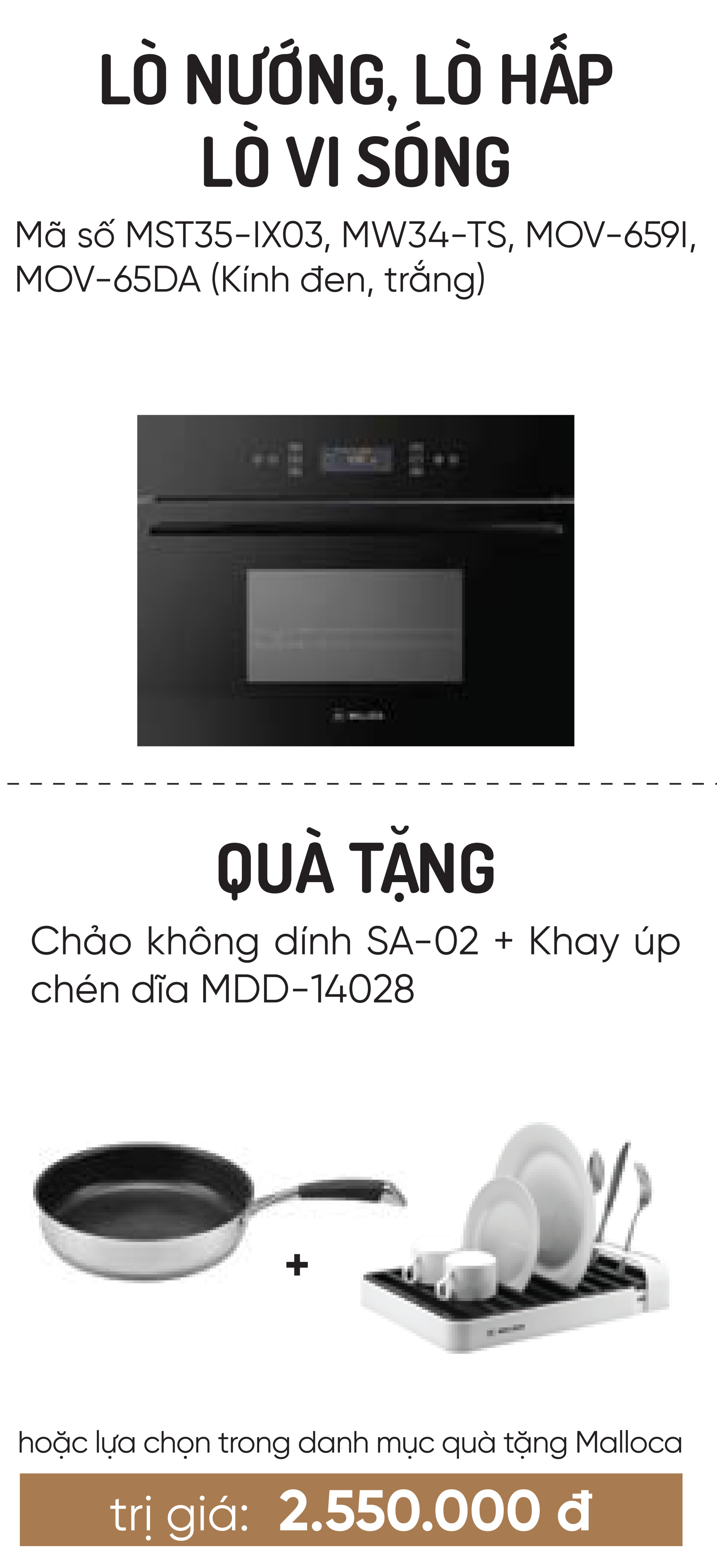- Malloca là thương hiệu thiết bị nhà bếp cao cấp được đăng ký bảo hộ thương hiệu từ Tây Ban Nha, các thiết kế lò vi sóng, lò hấp và lò nướng Malloca đều mang đặc trưng của phong cách châu Âu hiện đại, tinh tế với các chức năng tiện dụng, thông minh.