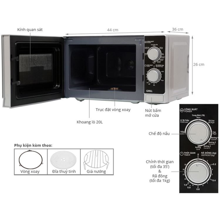 Tính năng nổi bật : – Bảng điều khiển cơ học dễ dàng sử dụng – 6 mức công suất linh hoạt cho ngưởi sử dụng – Tích hợp chức năng nướng tiện dụng – Thiết kế sang trọng hiện đại. THÔNG SỐ KỸ THUẬT Đường kính đĩa 24,4cm Công Suất Đầu Ra (vi sóng) 700W Công Suất Đầu Vào(vi sóng) 1100W Điện Áp 220v-50hz Dung Tích Lò Vi Sóng 20L Trọng lượng khoảng 10,5 kg Công Suất Nướng 720W Kích thước bề ngoài (cm) 47 x 38 x 28.5