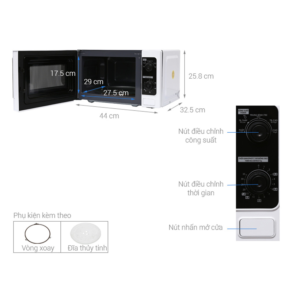 [THÔNG SỐ KỸ THUẬT] Dung lượng: 20L (0.7 Cu.ft) Tiêu thụ điện (Lò vi sóng): 1050 W Kích thước bên ngoài (RxCxS): 440 x 259 x 337.5 mm Thiết kế Màu sắc: Đen