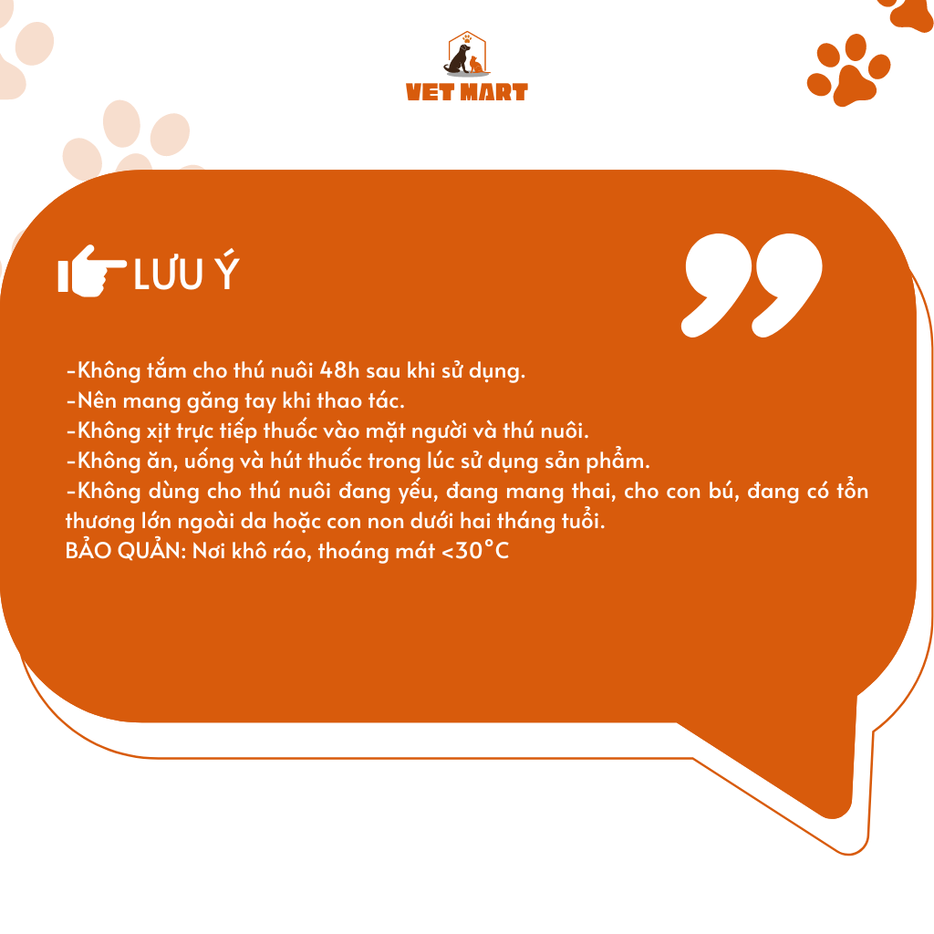 -Không dùng cho thú nuôi đang yếu, đang mang thai, cho con bú, đang có tổn thương lớn ngoài da hoặc con non dưới hai tháng tuổi.