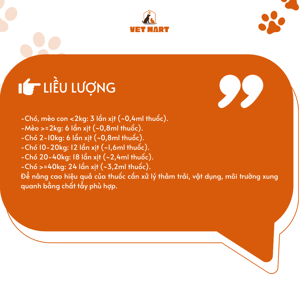 -Chó, mèo con <2kg: 3 lần xịt (~0,4ml thuốc).