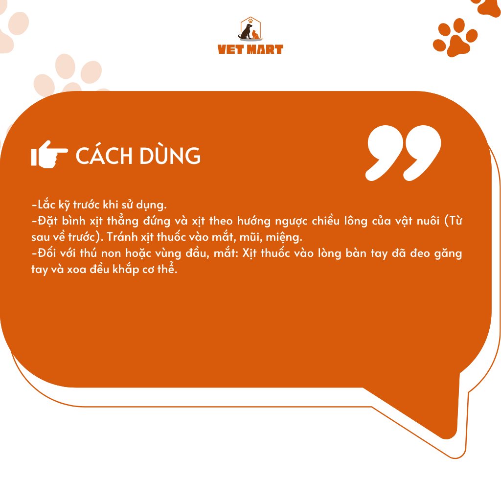 -Đặt bình xịt thẳng đứng và xịt theo hướng ngược chiều lông của vật nuôi (Từ sau về trước). Tránh xịt thuốc vào mắt, mũi, miệng.