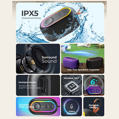 - Âm thanh sống động, rõ nét với công suất 5W — phù hợp không gian nhỏ và vừa. - Kết nối Bluetooth 5.3 ổn định, phạm vi hoạt động lên đến 30m. - Kháng nước