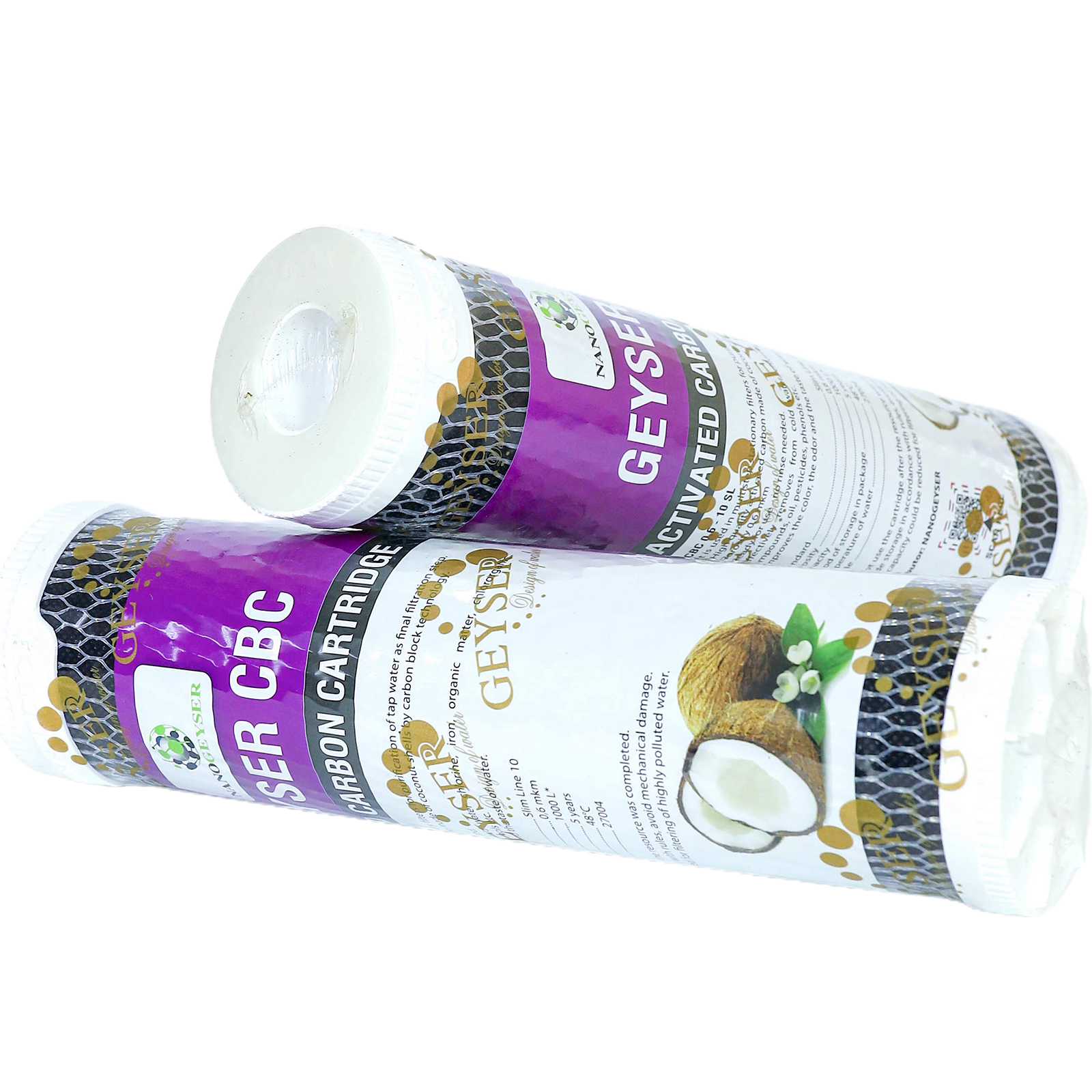 Lõi CTO 10 inch sử dụng vật liệu than hoạt tính gáo dừa tự nhiên cao cấp dạng nén (than hoạt tính được xay nhỏ sau đó ép bằng máy thủy lực thành dạng hình